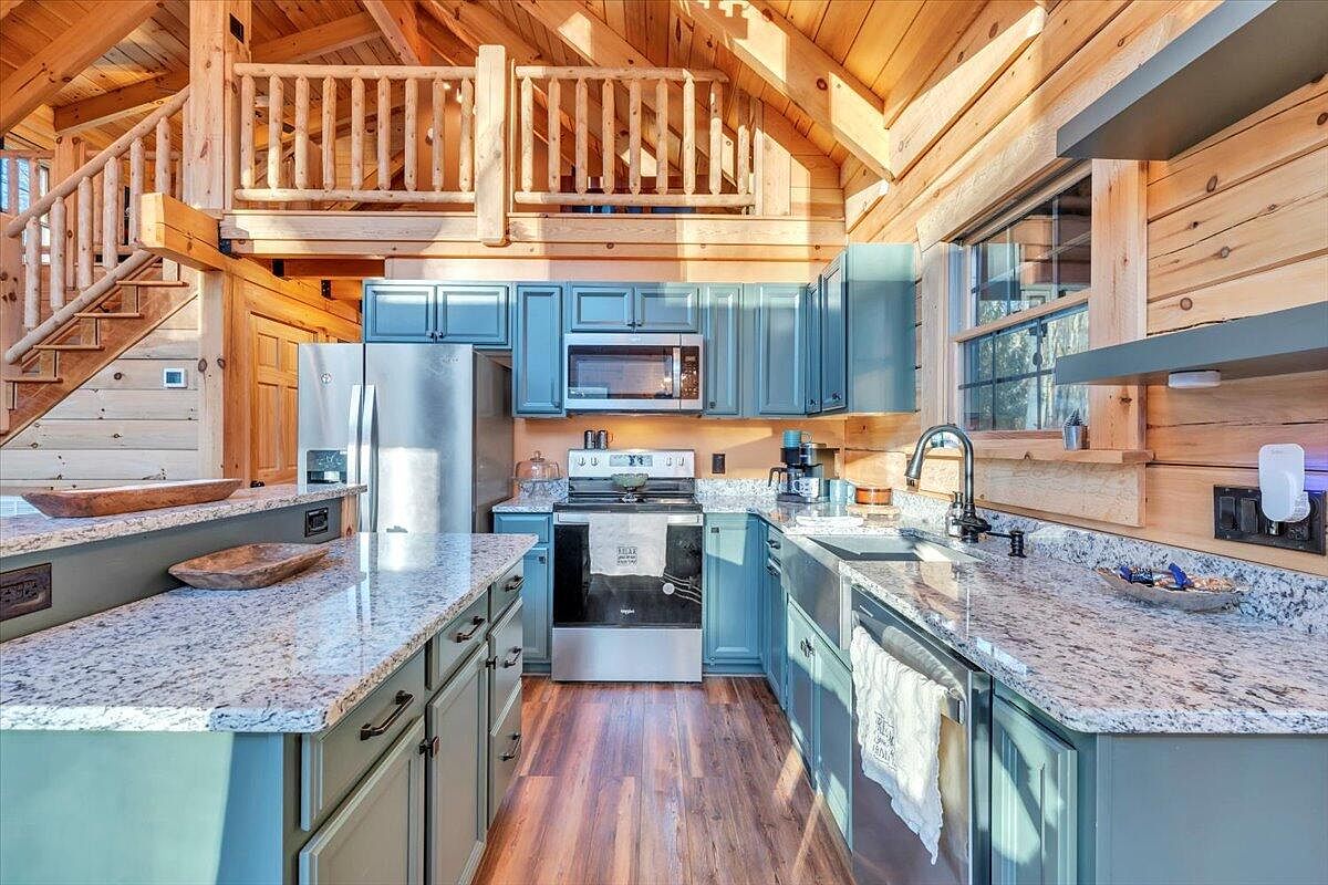 This kitchen features a blend of rustic charm and modern amenities. The open layout showcases wooden beams and a high, sloped ceiling, enhancing the spacious feel. Pale blue cabinetry contrasts beautifully with white granite countertops, while stainless-steel appliances add a contemporary touch. A cozy living area, positioned nearby, includes a stone fireplace framed by natural wood and a large television overhead. Soft, warm lighting emanates from an antler chandelier, creating an inviting atmosphere. Plush seating complements the design, and the wooden flooring enhances the natural aesthetic, harmonizing with the overall cabin vibe.