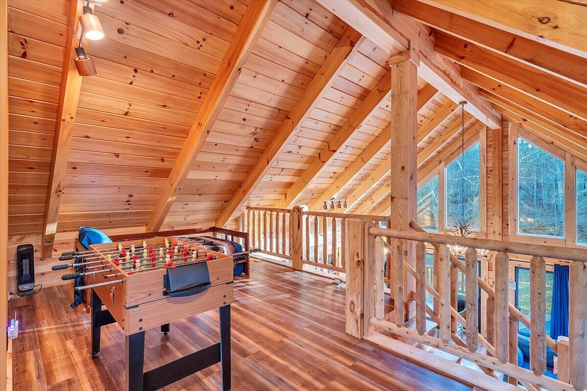 The loft area features a warm, rustic aesthetic with soaring angled ceilings made of natural wood. The rich wooden beams and planked walls create a cozy atmosphere. A foosball table occupies the center, surrounded by rich, hardwood flooring that enhances the inviting feel. Large windows allow abundant natural light, emphasizing the room’s openness and connection to the outdoors. A wooden railing adds safety while complementing the overall design theme. Soft blue accents from furnishings introduce a subtle contrast, integrating playfulness with the room’s warm wood tones, making it an ideal space for leisure and relaxation.