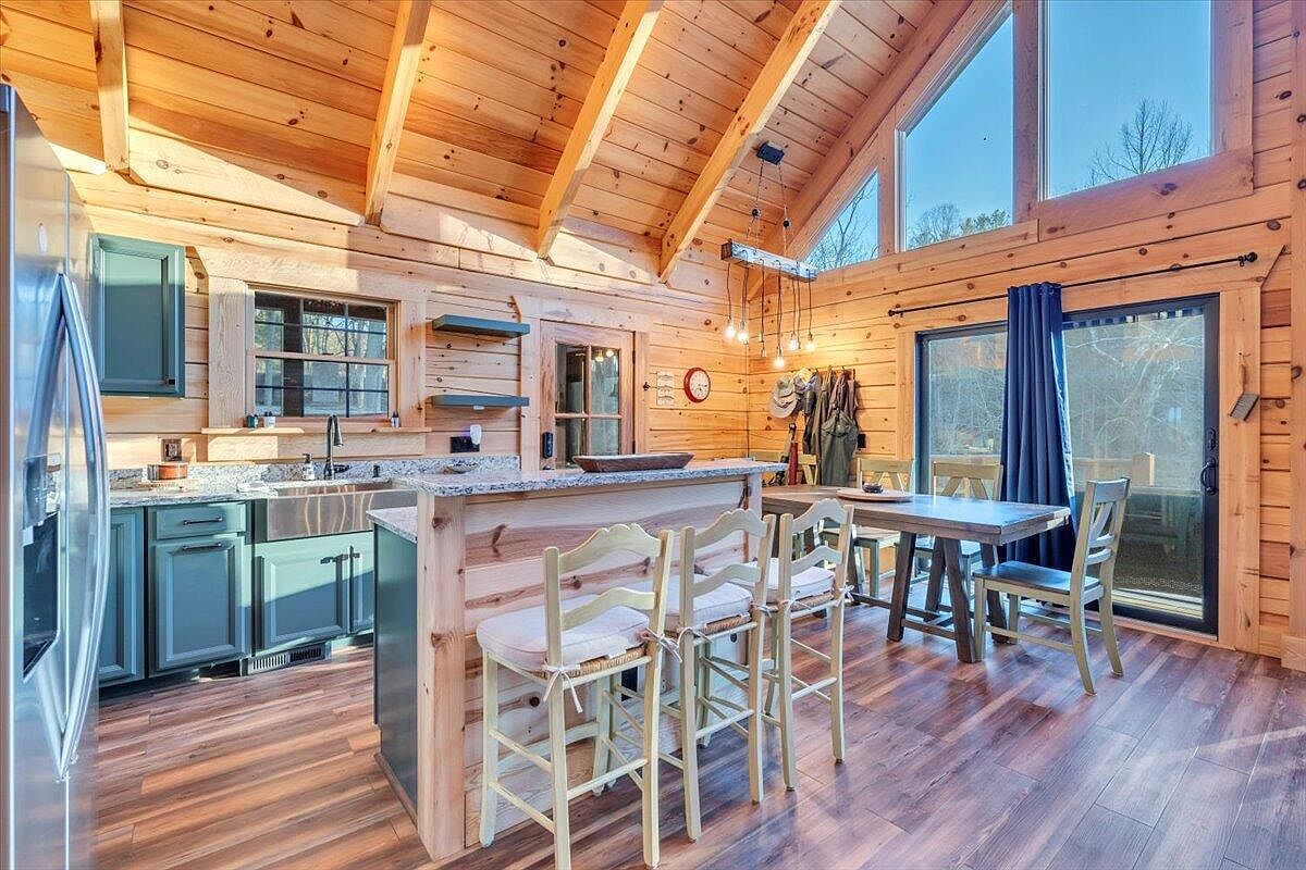This kitchen features a warm, rustic design with exposed wooden beams and logs forming the walls. The ceiling is vaulted, enhancing the spacious feel. Dark green cabinetry contrasts beautifully with the light wood tones, while granite countertops offer a sleek surface. A robust, rectangular dining table made of wood complements the area, surrounded by matching chairs. Bar stools with soft cushions line the kitchen island. Large windows let in natural light and allow views of the outdoors. Pendant lighting above the island adds a modern touch, creating a perfect blend of cozy farmhouse and contemporary elements.