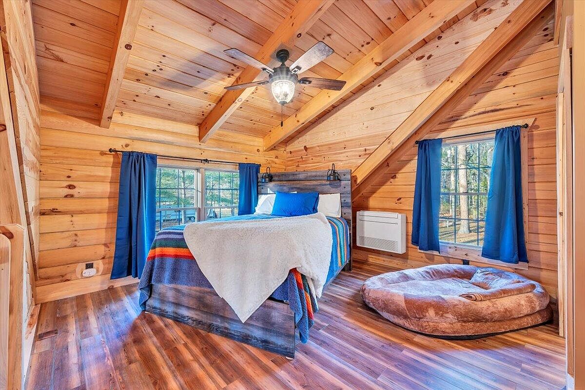 This cozy bedroom features a sloped wooden ceiling with exposed beams, enhancing its rustic charm. The walls are clad in natural wood, paired with a warm wooden floor, creating a harmonious feel. A large window draped with navy blue curtains invites ample natural light, illuminating the space. The bed, adorned with colorful striped blankets, is positioned against a wooden headboard with stylish wall sconces. A plush, round dog bed adds a playful touch to the corner. The overall aesthetic is inviting and comfortable, with a blend of modern elements and rustic warmth that fosters relaxation.