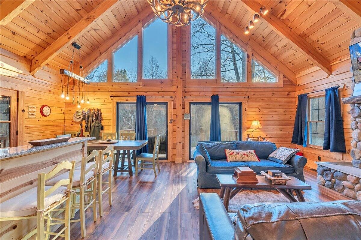 This living room features a cozy, rustic design with warm wooden accents and a high vaulted ceiling, inviting a sense of spaciousness. The walls and ceiling showcase natural wood panels, enhancing the room’s warmth. Large windows fill the space with light, framed by deep blue curtains. Comfortable seating includes a blue couch adorned with decorative pillows, while a wooden coffee table adds an earthy touch. The dining area features a light wooden table with mismatched chairs, ideal for casual meals. A stone fireplace anchors the room, complemented by a chandelier that provides warm, ambient lighting.
