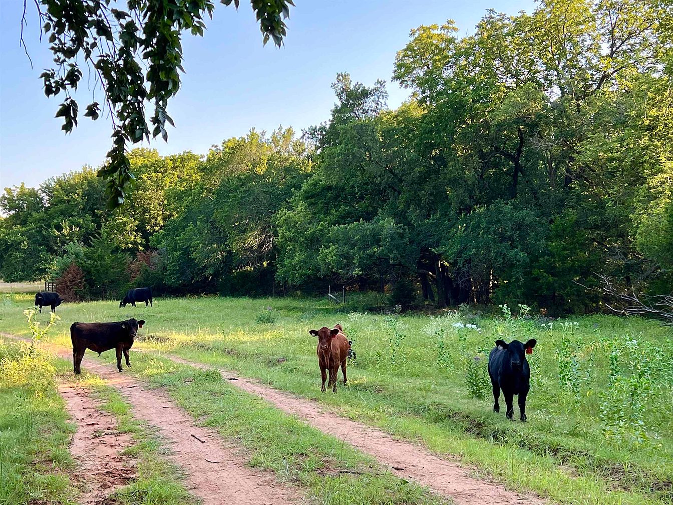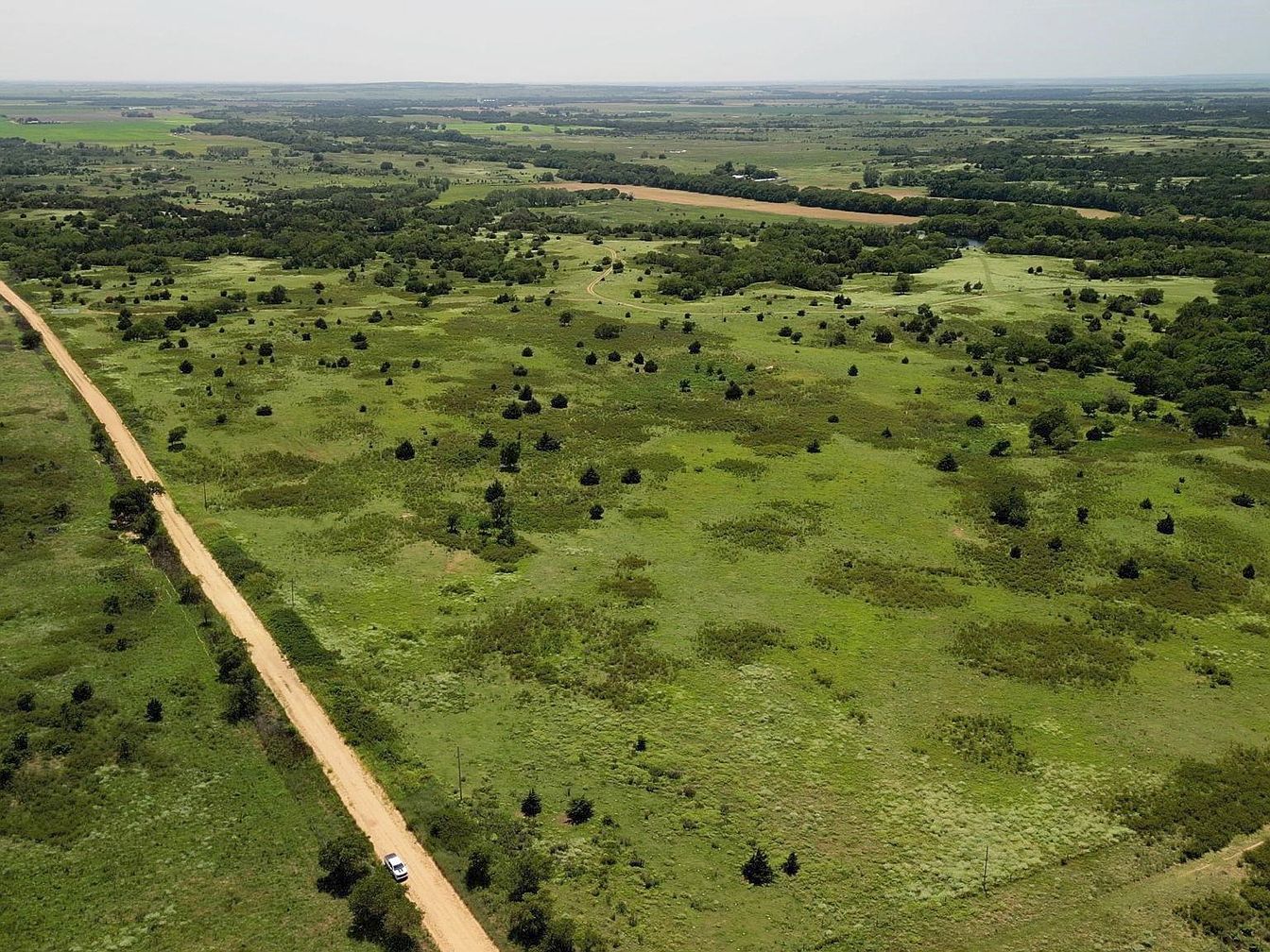 A sweeping aerial view of a vast expanse of lush greenery and open fields, punctuated by patches of trees and shrubs. A dirt road meanders through the landscape, bordered by vibrant green grasses and wild flora. The rich tones of the earth contrast beautifully with the freshness of the grass, creating a tranquil and serene atmosphere. In the distance, the land gently rolls, suggesting the presence of hills or valleys, enhancing the natural beauty. A solitary vehicle is visible on the road, emphasizing the spaciousness of the area, inviting exploration of this idyllic rural setting.