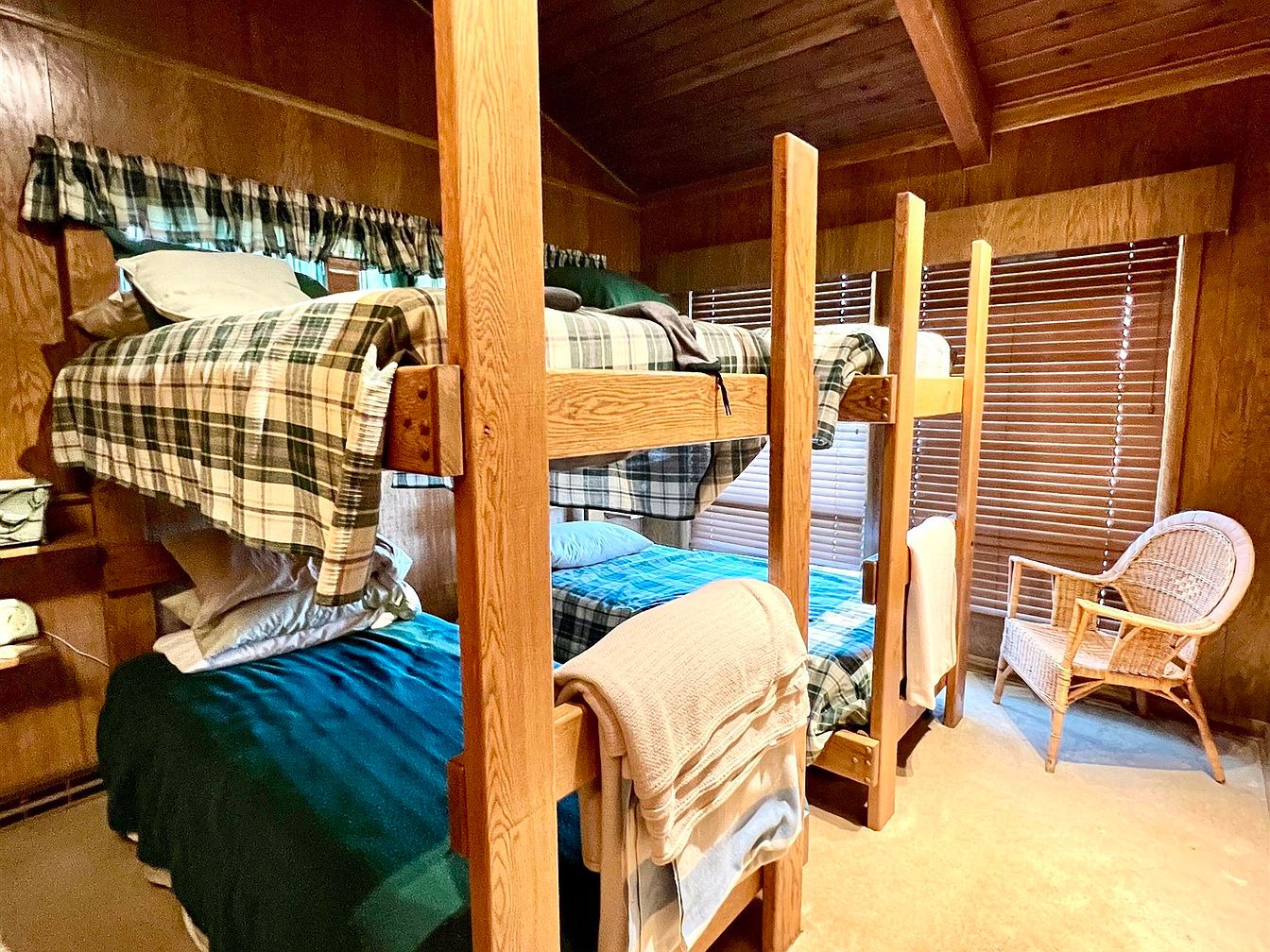 This cozy bunk room features a warm, rustic design with rich wooden paneling. Two sets of sturdy wooden bunk beds are adorned with plaid bedding in green and cream hues, enhancing the inviting atmosphere. A small chair made of woven material adds a charming touch while providing a cozy reading nook. Natural light filters through wooden blinds, casting a warm glow. The floor is carpeted in a light beige, harmonizing with the room’s natural tones. Pillows are neatly arranged, creating an inviting space for relaxation. This room is perfect for accommodating multiple guests while retaining a homely feel.