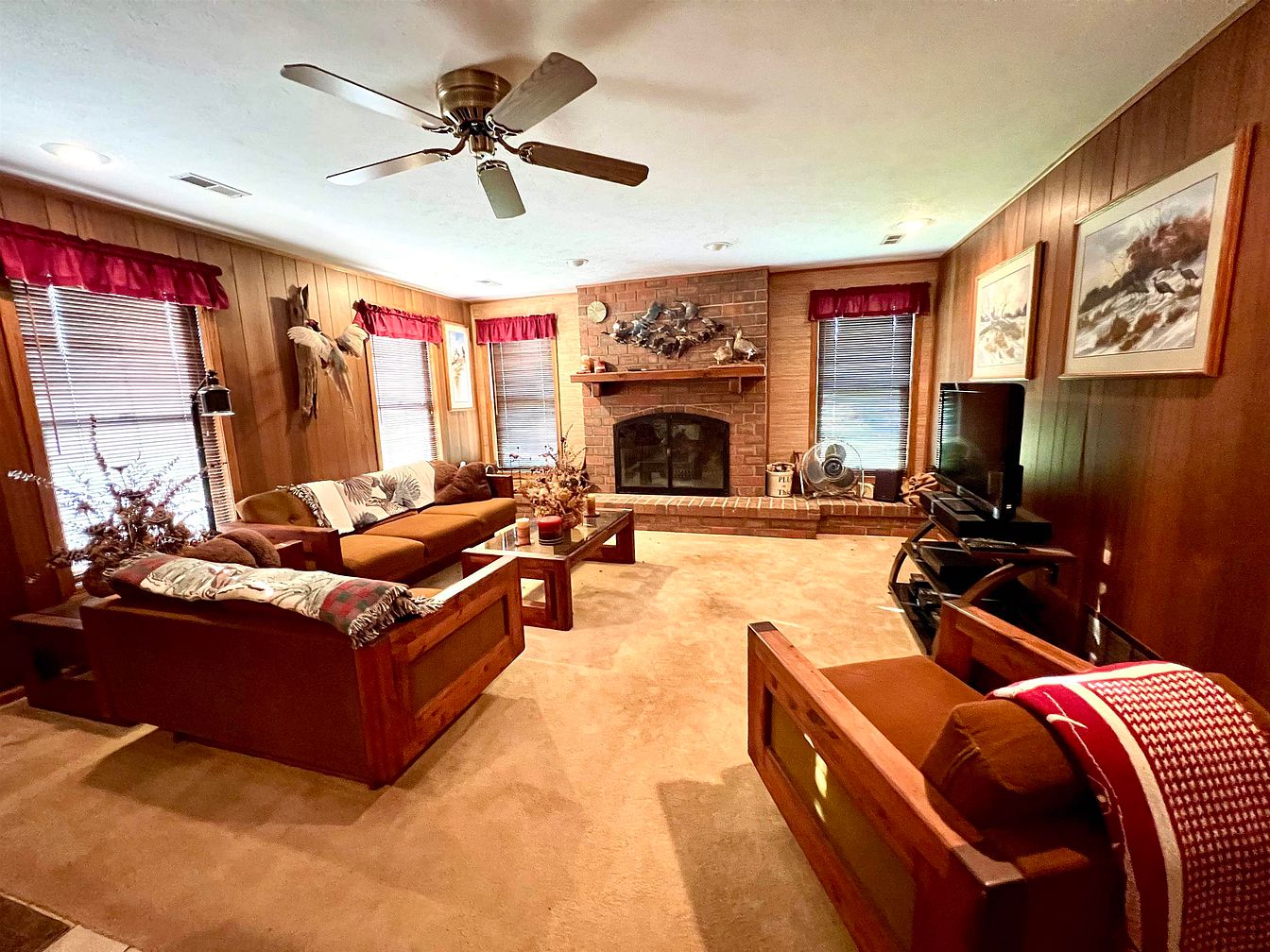 A cozy living room features warm wooden paneling and plush carpeting. Two inviting sofas, adorned with decorative throws and cushions, are positioned around a glass coffee table. A charming brick fireplace anchors the space, surrounded by rustic decorations and framed artwork of serene landscapes. Natural light filters through wooden blinds, accented by deep red valances, contributing to a warm ambiance. A ceiling fan circulates air, enhancing comfort. Across the room stands a modern entertainment unit, juxtaposing classic elements with contemporary style, creating a harmonious blend of comfort and aesthetic appeal, ideal for relaxation and entertainment.