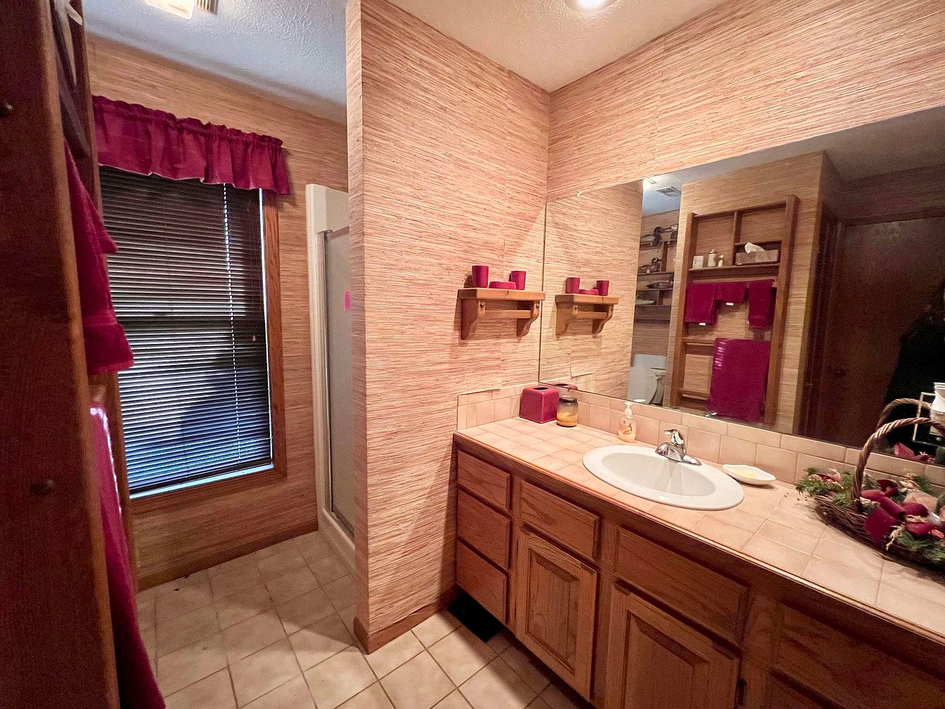 This bathroom features a warm, inviting ambiance with light wood cabinetry and tan tiled flooring. Textured wallpaper adds depth, while a frameless mirror enhances the sense of space. Rich burgundy accents, seen in the curtains and towels, complement wooden shelves displaying personal items. A walk-in shower is partially visible, indicating practicality. Natural light filters through the window, adorned with blinds for privacy. A ceramic sink sits atop the counter, surrounded by a subtle decorative arrangement. The space cleverly balances functionality with cozy aesthetics, providing a relaxing environment for daily routines.