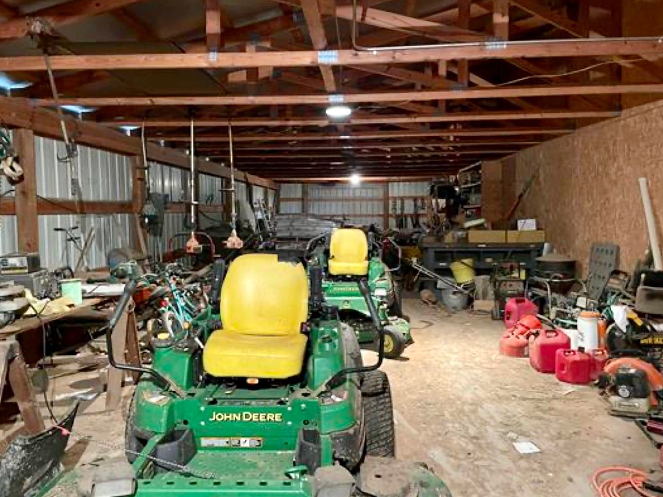Inside a spacious equipment shed, the environment is functional with a rustic charm. Two bright yellow John Deere mowers dominate the foreground, emphasizing their utility. The shed showcases a mix of agricultural tools and equipment, scattered across wooden shelves and tables. Above, exposed wooden beams create an airy feel, complemented by metal walls that reflect light. The dirt floor indicates heavy use, adding to the rugged character of the space. Gas cans in red and orange contrast with the green machinery, contributing to a vibrant yet practical color scheme. Overall, the atmosphere reflects a hardworking, agricultural lifestyle.