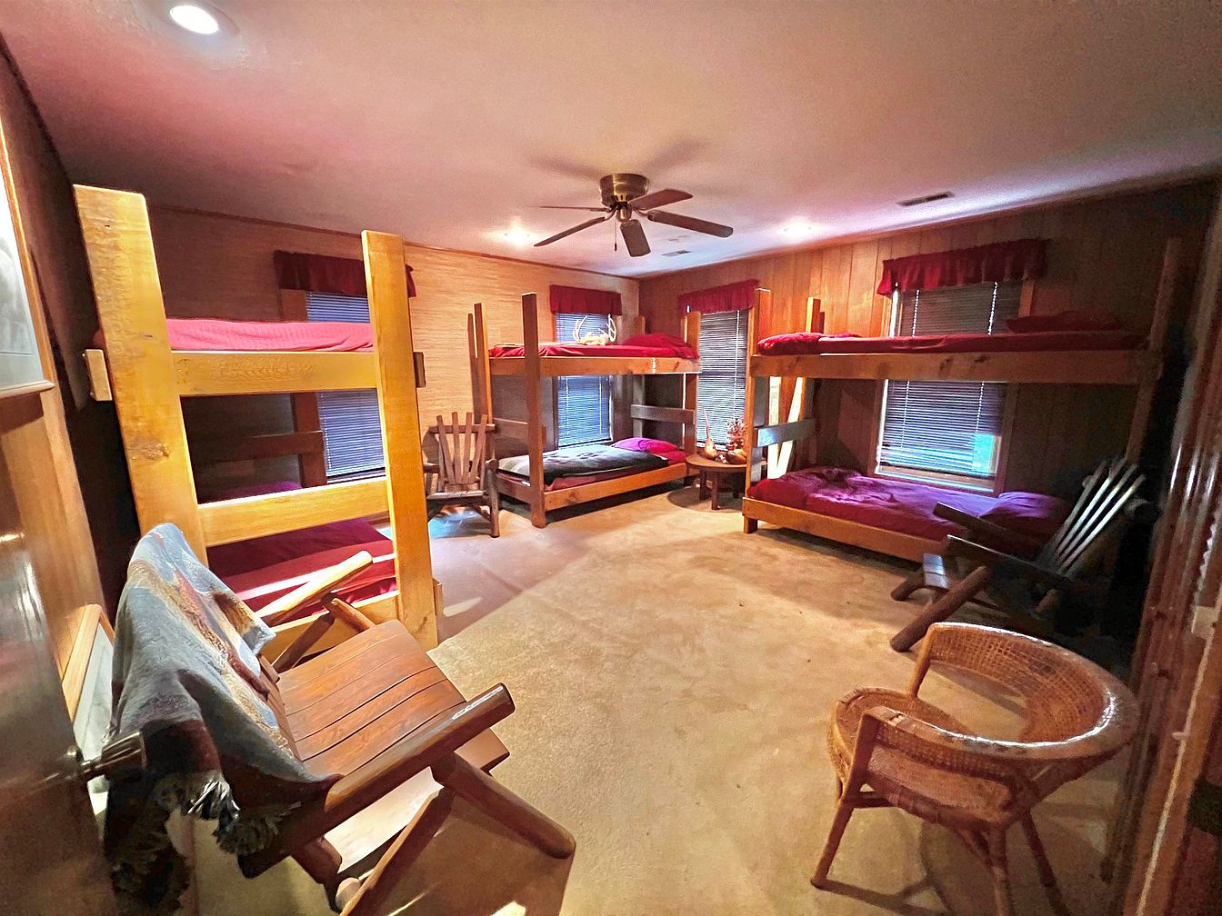 This cozy bunk room features two sets of sturdy wooden bunk beds, crafted from natural wood, adding a rustic charm. Each bed is outfitted with deep red bedding, which contrasts beautifully against the warm, wood-paneled walls. Large windows with wooden blinds allow soft light to filter in, enhancing the room’s inviting atmosphere. A ceiling fan circulates air, contributing to comfort. In the corners, a couple of wooden chairs provide additional seating, complementing the cabin-like aesthetic. A soft, beige carpet covers the floor, adding warmth and inviting guests to relax after a long day.