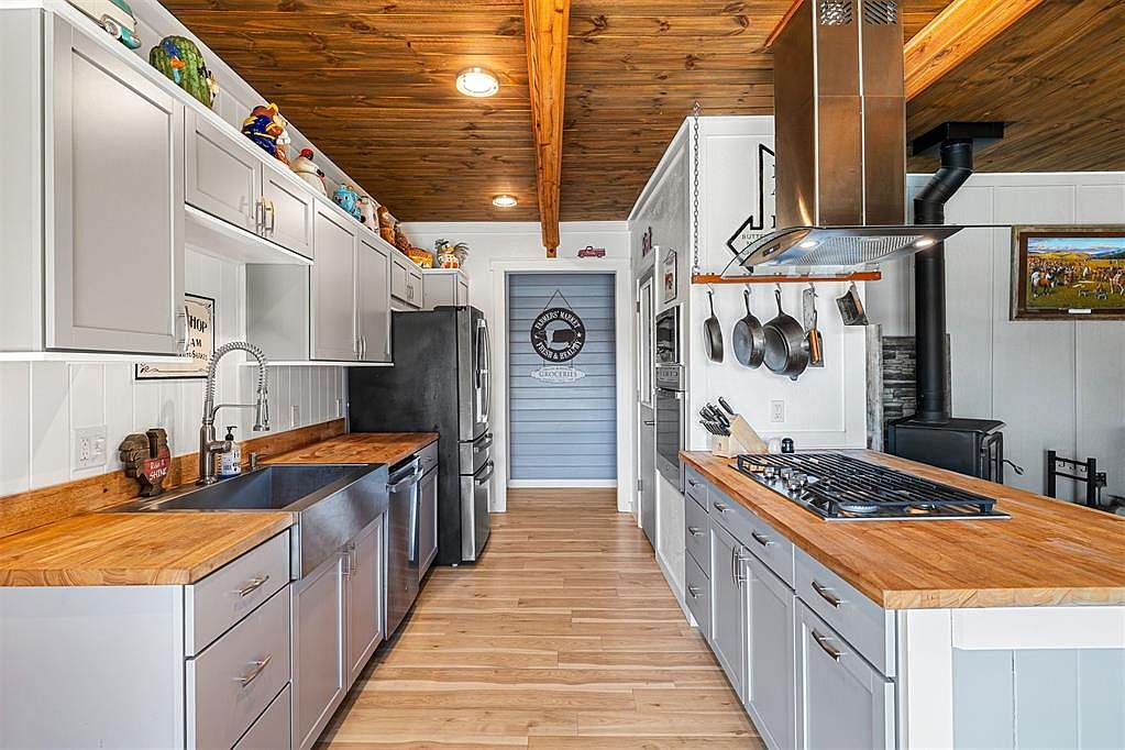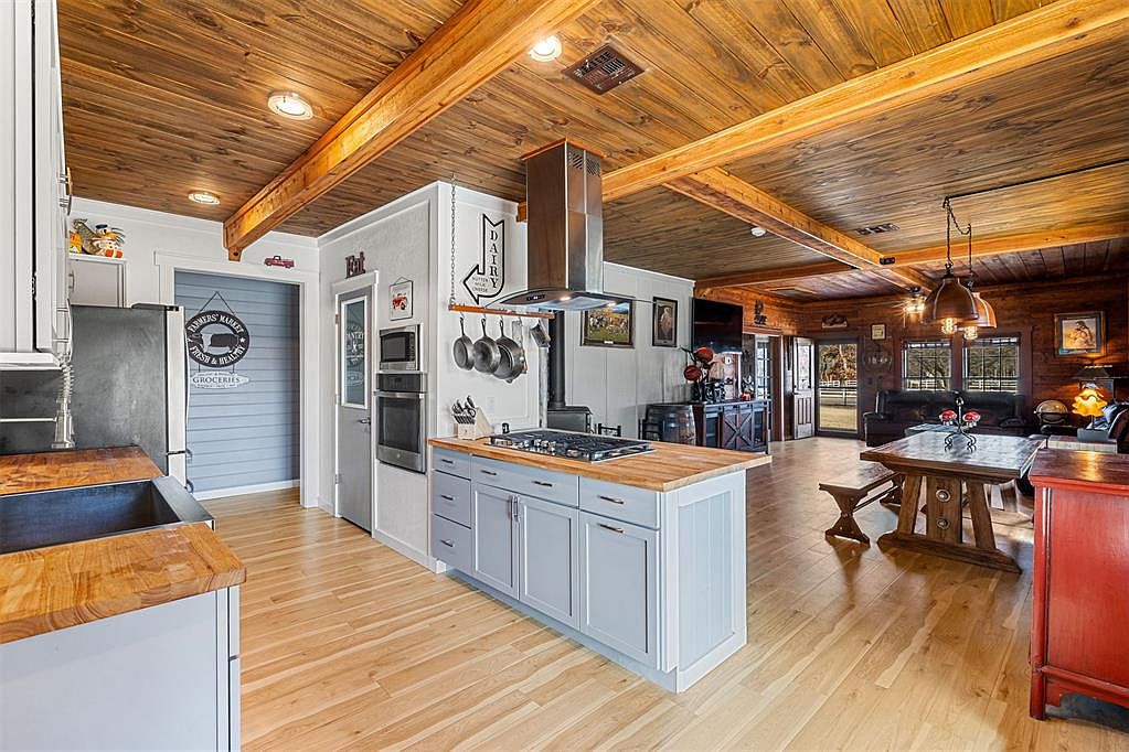 This kitchen space features a blend of rustic charm and modern functionality. Light wood flooring contrasts with the dark wooden ceiling. The central island has a butcher block top, complemented by grey cabinetry and a sleek stovetop. Stainless steel appliances add a contemporary touch, while vintage wall decor and cozy lighting create a welcoming atmosphere. A doorway leads to a complementing blue accent wall adorned with nostalgic signage. The space is open, promoting easy movement, and connects seamlessly to a cozy living area, enhancing both aesthetic appeal and practicality in this historic home.