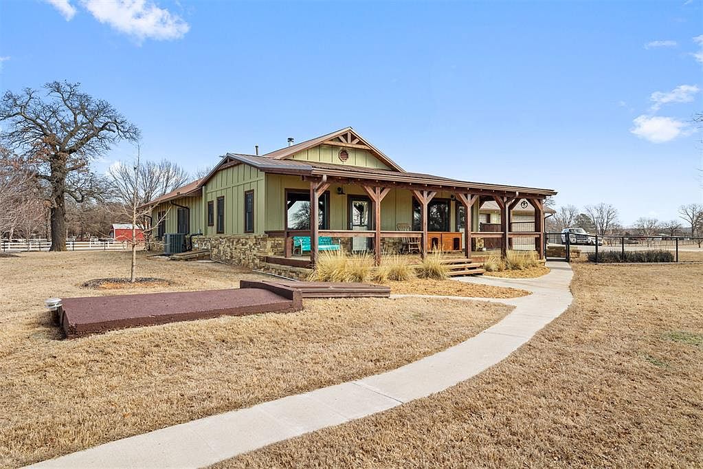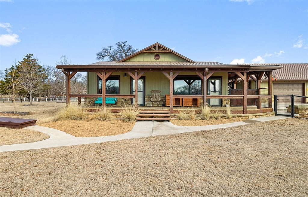 The entrance features a spacious covered porch supported by wooden beams, creating a welcoming atmosphere. A muted green facade complements the rustic aesthetics, accented by natural stone walls. A warm-toned bench, adorned with cushions, invites relaxation, while the nearby potted plants add a touch of greenery. The roof is adorned with metal sheeting, enhancing durability and style. Large windows framed in dark wood provide ample natural light, showcasing the house’s interior. A flag motif adds a patriotic flair, harmonizing with the country charm of the architecture. The cement driveway leads smoothly to the inviting front entrance.
