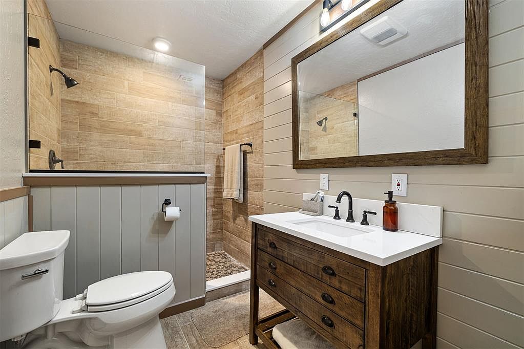 A modern bathroom featuring a combination of natural textures and contemporary design. The shower area boasts warm, earthy tiles that create a cohesive look with the wooden accents. A sleek white vanity with a contrasting dark wooden base is centered against a backdrop of light gray shiplap wall, enhancing the room’s spaciousness. Above the sink, a large mirror framed in rustic wood reflects the soft ambient light from stylish fixtures. Contrasting black fixtures add a touch of sophistication, while the organized layout maximizes functionality. The floor features complementary tiles, providing a stylish yet practical surface.