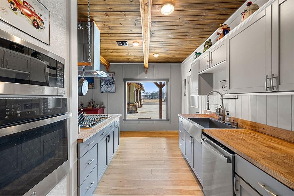 A spacious kitchen features a contemporary design with light gray cabinetry and wooden countertops that provide warmth. The layout is linear, allowing for easy movement between the cooking area and sink. A large window invites natural light, showcasing an outdoor view. Stainless steel appliances, including a double oven and a dishwasher integrated seamlessly with cabinetry, add a modern touch. The ceiling is adorned with exposed wooden beams, creating a rustic charm that contrasts beautifully with sleek materials. Decorative items on shelves and whimsical wall art add personal character, blending function with inviting aesthetics.