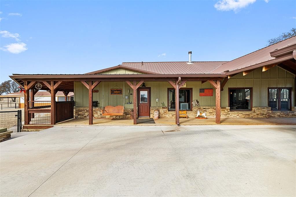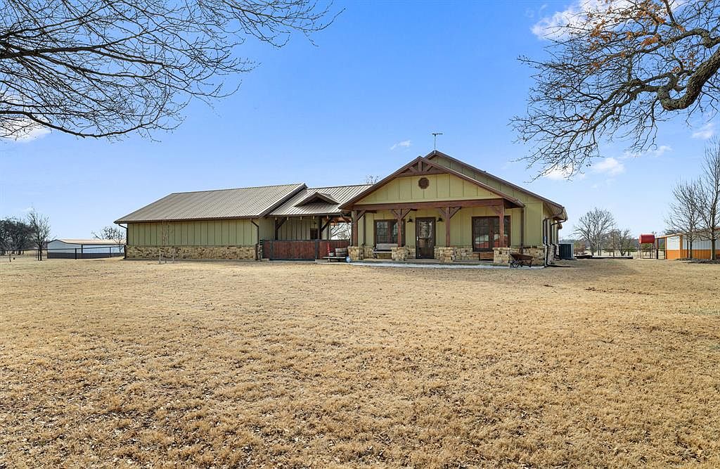 A spacious exterior showcases a rustic American home with a distinctive color palette. The house features a brown metal roof complemented by olive green siding, creating a warm and inviting atmosphere. The front porch, adorned with wooden rocking chairs, invites relaxation, while the stonework at the base adds texture. A circular driveway facilitates vehicle access amidst a well-maintained lawn edged by a black fence. Surrounded by trees and expansive fields, the setting emphasizes a connection to nature, enhancing the property’s rural charm. Clear skies above complete the picturesque scene, highlighting the home’s inviting appeal.