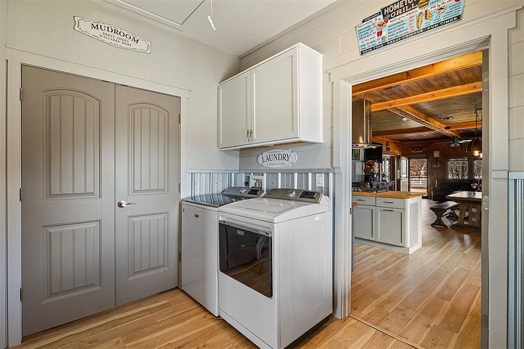 The laundry room features a compact yet functional layout, highlighted by white cabinetry and stylish appliances. A spacious white countertop complements the washing machine and dryer, enabling easy folding and organization. The color scheme includes soft greys and whites, accented by natural wood tones visible through the doorway to the kitchen. Architectural details include paneled walls topped with a beadboard, enhancing the rustic feel. A subtle sign labeled ‘Laundry’ adds charm, while the adjacent double doors, painted in a matching grey, offer a transition to the nearby mudroom, showcasing a practical, cohesive design.