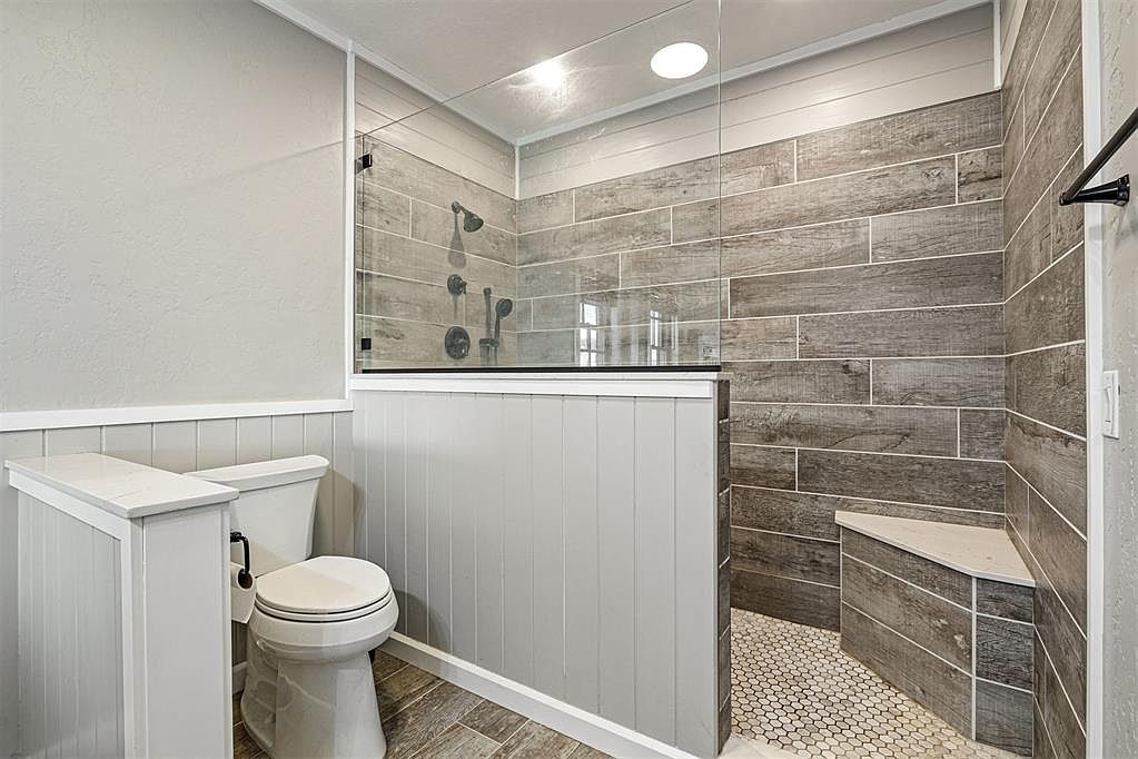 This modern bathroom features a sleek and minimalistic design. The walls are adorned with large gray wooden tiles, complemented by a white subway tile trim. A glass shower enclosure allows natural light, showcasing dual showerheads in a matte black finish. The hexagonal mosaic tile floor adds a touch of texture beneath a built-in bench. A compact, white toilet sits beside a chic vanity, offering both functionality and style. The color palette is neutral, enhancing the spacious feel and emphasizing cleanliness, while the combination of materials creates a harmonious balance between contemporary and rustic aesthetics.
