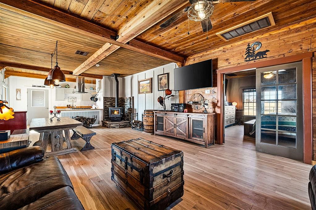 This living room features a cozy, rustic aesthetic with wood elements dominating the space. The ceiling showcases exposed wooden beams, enhancing the natural warmth. An assortment of furniture includes a large leather sofa, a sturdy wooden dining table, and a decorative wooden trunk, providing both function and style. A charming stone fireplace serves as a focal point, accented by subtle lighting from industrial-style pendant lamps. The walls are a mix of warm wood panels and soft white, complemented by decorative art pieces that evoke a sense of outdoors. The arrangement promotes an inviting, communal atmosphere.