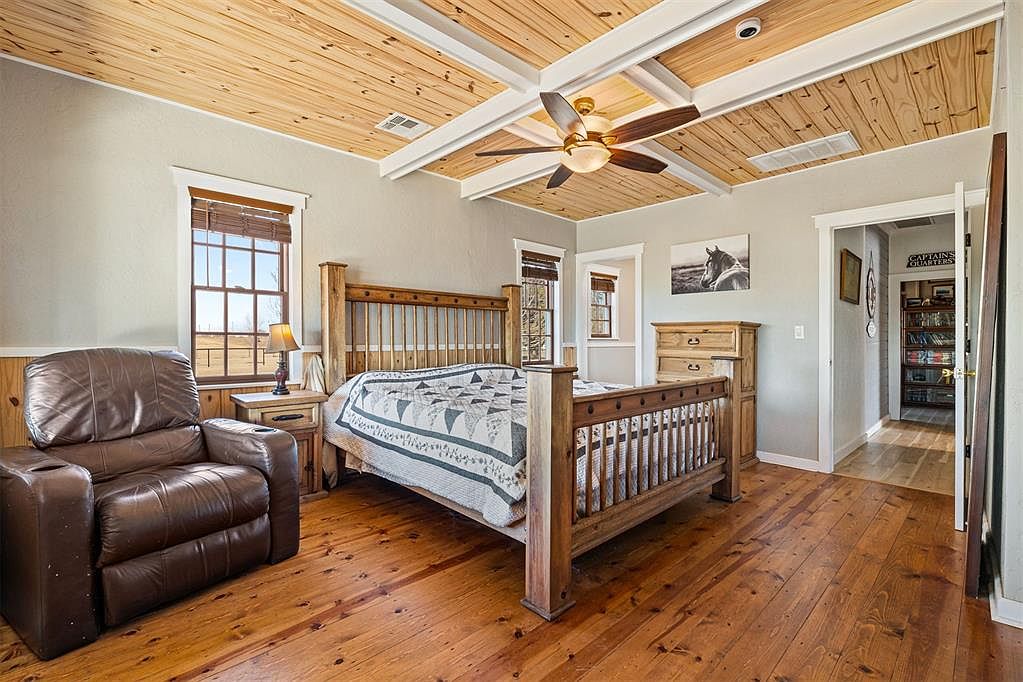 This cozy bedroom features warm wood tones and a rustic charm. The ceiling showcases exposed wooden beams, enhancing the room’s character. A rich, polished wooden floor contrasts with the pale gray walls, complemented by a decorative quilt adorning the bed. The solid wood frame of the bed adds a touch of elegance. A brown leather recliner invites relaxation beside a bedside table with a warm lamp. Natural light filters through window blinds, illuminating the space. An adjacent doorway leads to additional rooms, while framed artwork on the walls connects with the home’s historical theme.