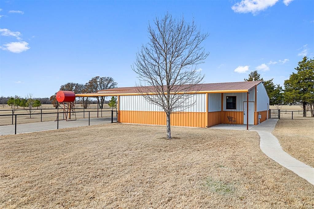 This exterior view reveals a modern barn-style structure, characterized by a blend of white and orange siding and a pitched metal roof. A distinctive red water tank stands prominently next to the building, enhancing the rustic charm. The surrounding landscape features a vast expanse of golden grass, dotted with a few sparse trees, contributing to the serene environment. A stone pathway leads to the entrance, gently curving to match the natural topography. The large windows allow ample natural light, creating a welcoming vibe, while the fenced area adds a sense of security and delineates the property boundaries.