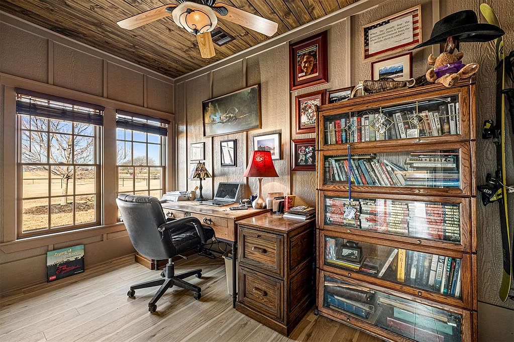 This home office features a warm, rustic aesthetic with natural wood textures dominating the design. A rich wooden desk sits prominently, accompanied by a comfortable black swivel chair. Adjacent to the desk, a large glass-fronted bookshelf displays a well-organized collection of books and memorabilia. The walls are adorned with framed pictures and quotes, adding a personal touch. Natural light floods in through spacious windows, illuminating the space and showcasing the views of the landscape outside. A ceiling fan with a light fixture adds functionality and charm to the inviting atmosphere.