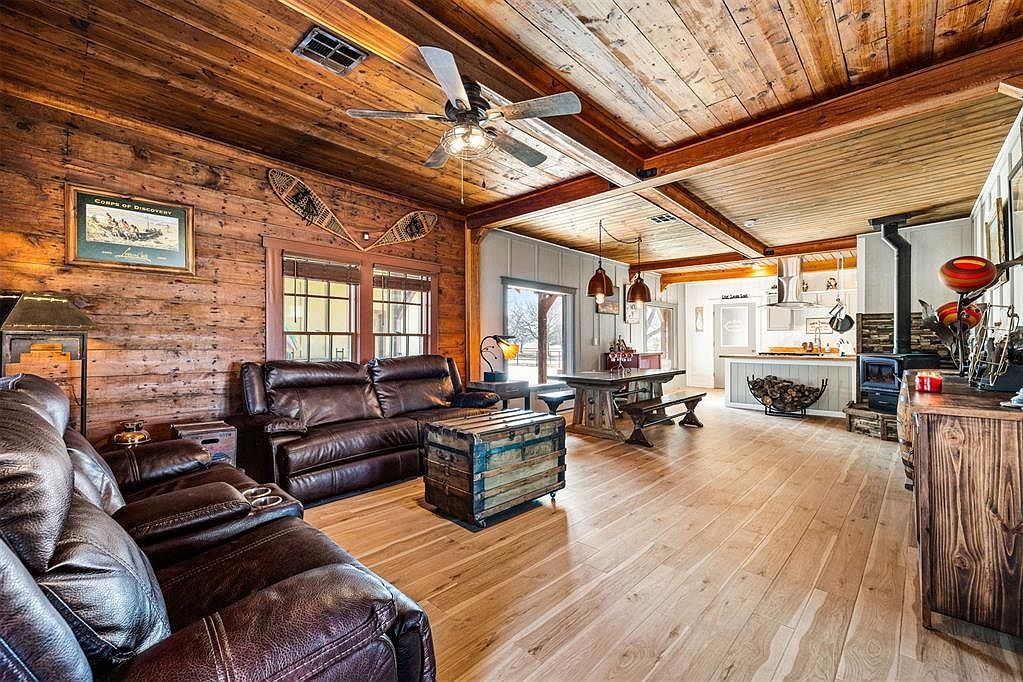 A cozy living room featuring rich wooden walls and a warm atmosphere. The layout includes dark leather sofas that complement a rustic wooden coffee table, crafted from an aged crate. Light, natural wood flooring enhances the inviting feel of the space. The ceiling showcases exposed beams and a wood texture, while recessed lighting and a stylish ceiling fan add modern touches. Large windows provide ample natural light, connecting the interior with the outdoor landscape. Decorative elements include vintage wall art and a standalone lamp, emphasizing a blend of classic decor and contemporary design.