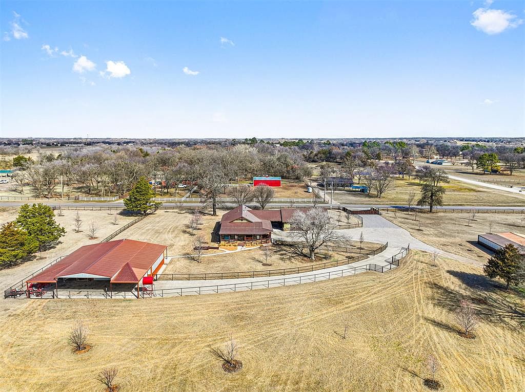 This aerial view captures a sprawling estate surrounded by a vast landscape. The main house, characterized by a traditional American design, features a cozy wooden porch and a sloped roof with reddish-brown shingles. Nearby, a large barn stands with a similar roof style and an open area, suggesting functional versatility. The property is bordered by a mix of green trees and manicured lawns, enhancing its rustic charm. A winding driveway connects various structures, adding to the property’s inviting layout. The expansive grounds emphasize tranquility, showcasing the sprawling pastoral scenery and distant horizons.