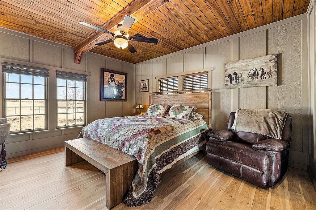 This cozy bedroom features a rustic aesthetic with a vaulted wooden ceiling that adds warmth. The walls have a textured finish, painted in a light taupe, enhancing the natural light from the large windows. A sizeable wooden bed with a handmade quilt serves as the focal point, flanked by two windows adorned with wooden blinds. A wooden bench at the foot of the bed complements the bedding’s earthy tones, while a plush brown leather chair invites relaxation. Artwork depicting equestrian themes and a tastefully placed bedside lamp add character, combining comfort with a hint of western charm.