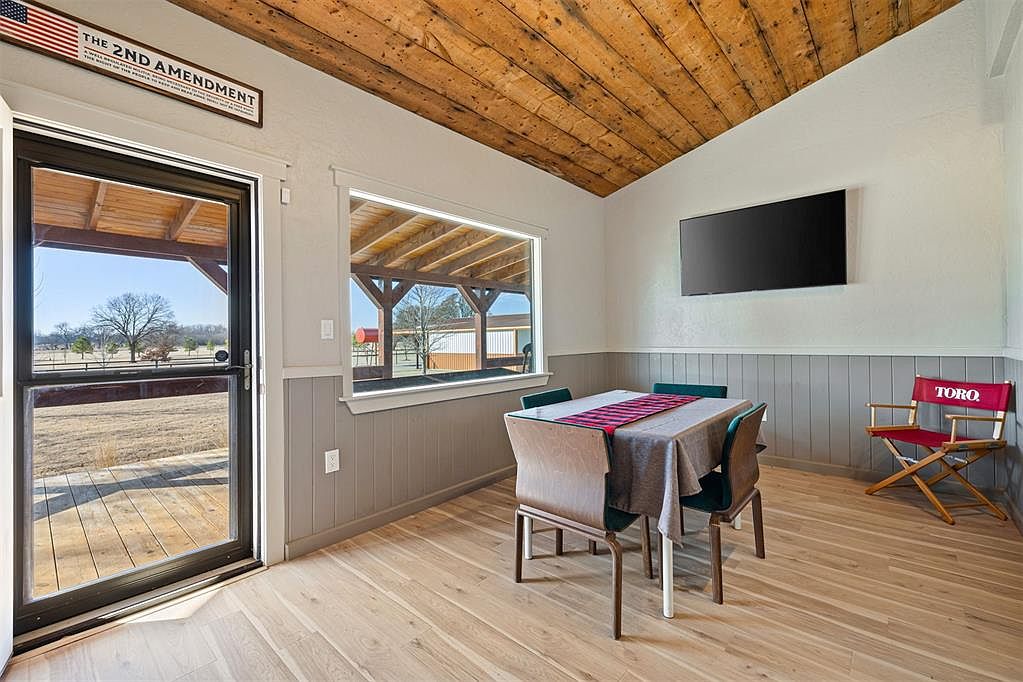 This dining area features a cozy layout with a wooden table at its center, dressed with a tablecloth and accented by a striped runner. Surrounding the table are four modern chairs with contrasting colors. Light-colored wood flooring complements the room’s neutral palette of soft beige walls and a grey wainscoting. A large glass door leads to an outdoor space with a view of the landscape, enhancing the connection to nature. The vaulted ceiling, finished in exposed wooden beams, adds character and warmth. A mounted flat-screen television offers modern convenience in this charming setting.