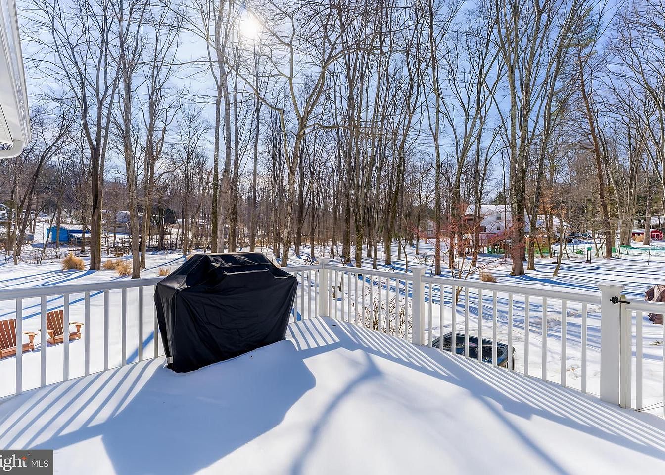 This image portrays a snow-covered deck, creating a serene winter landscape. A black grill stands prominently on the deck, contrasting with the pristine white snow beneath. The railing features clean, white balusters, allowing an unobstructed view of the wooded backyard. In the distance, leafless trees stretch upwards, basking in sunlight. The ground is dotted with patches of snow, indicating a recent snowfall. Small structures, possibly play areas, are visible further back, adding a touch of color to the scene. The overall ambiance is tranquil, inviting contemplation of nature’s beauty during the winter months.