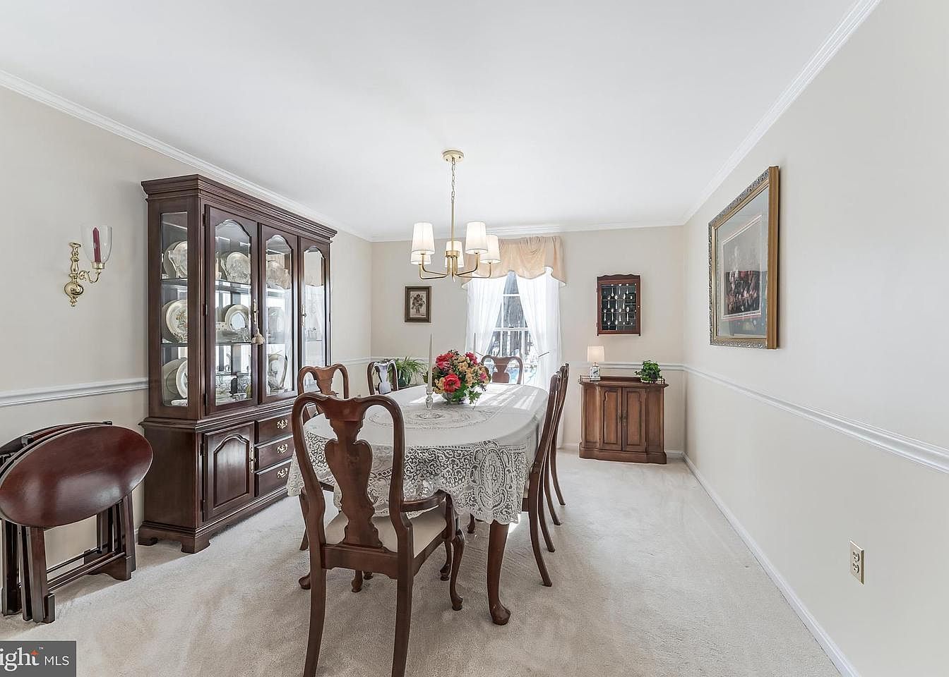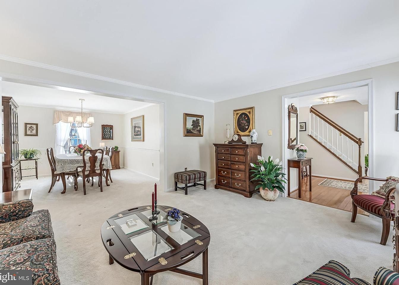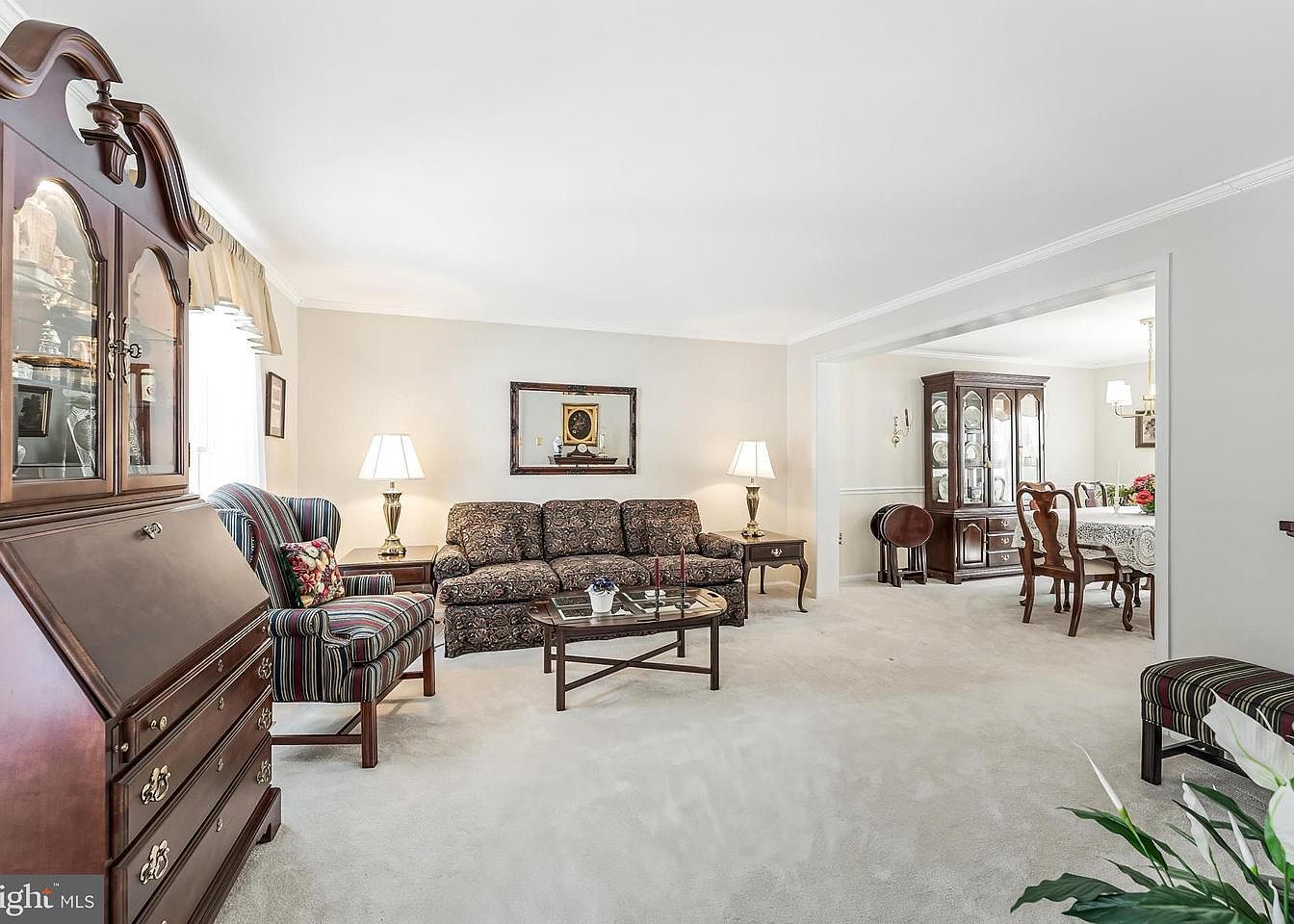 A spacious living room featuring plush beige carpeting and soft cream walls. A richly patterned dark floral sofa complements a classic striped armchair adorned with floral details. Two elegant lamps flank a glass-topped coffee table, creating a warm, inviting atmosphere. In the background, a charming dining area can be glimpsed through an open archway, showcasing a dark wood china cabinet filled with decorative plates. A round table with delicate table linens hints at gatherings. The thoughtful arrangement and tasteful decor reflect a balance of comfort and sophistication, embodying a traditional American home aesthetic.