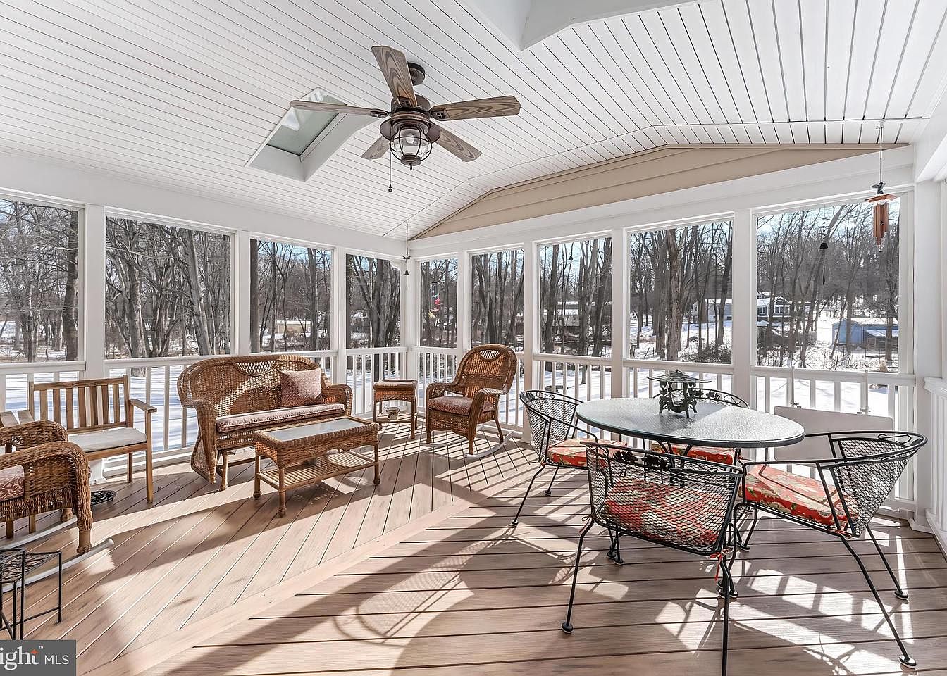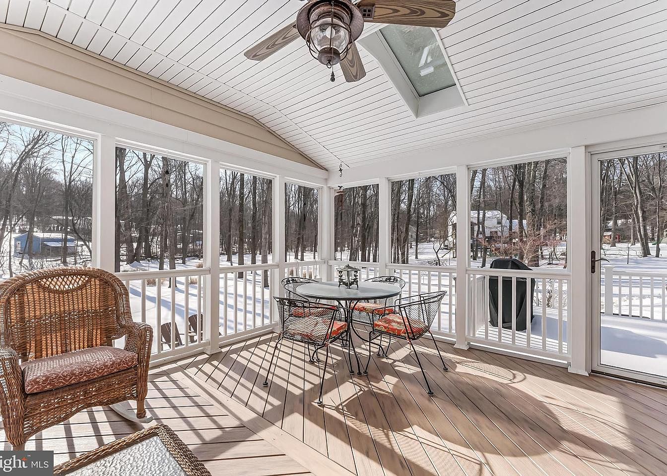 This sunroom features abundant natural light pouring in through large glass windows, surrounded by a wooden deck that merges indoor and outdoor spaces. The ceiling is a smooth white wood with an angled pitch, accentuated by a central ceiling fan for airflow. A round glass table with black metal chairs is complemented by warm orange cushions, creating a vibrant focal point. A cozy wicker chair with soft cushions adds comfort and invites relaxation. Outside, a serene winter landscape unfolds, adorned with snow and tall trees, enhancing the tranquil atmosphere of this inviting sun-drenched space.