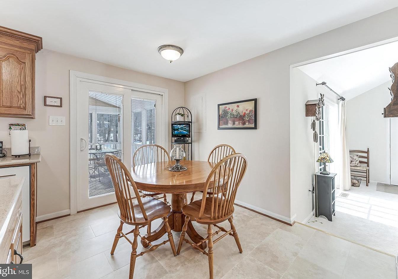 A cozy dining area showcases a round wooden table surrounded by four spindle-back chairs, ideal for casual meals. The light taupe walls harmonize with the warm wood accents, including the cabinetry that holds a subtle elegance. Natural light floods through large sliding glass doors leading to an outdoor space, amplifying the airy feel. A floral artwork hangs nearby, enhancing the serene atmosphere. A small decorative shelf stands in the corner, adding character and function. The flooring offers a sleek, neutral tile that’s easy to maintain, merging practicality with aesthetic appeal in this inviting space.
