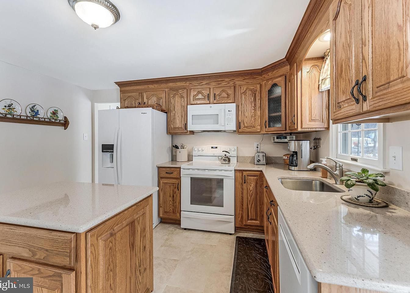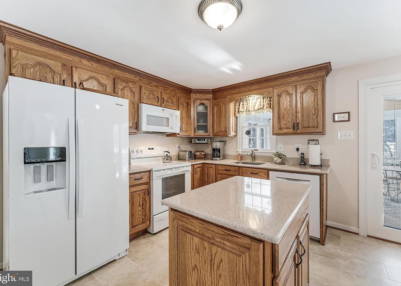 This kitchen showcases a warm and inviting design with rich oak cabinetry, beautifully detailed with raised paneling. A neutral beige and cream color scheme enhances the brightness, complemented by a spacious island featuring a polished countertop. Appliances are modern yet understated, including a white refrigerator, microwave, and a range seamlessly integrated into the cabinetry. Natural light floods in through a window adorned with a patterned valance, illuminating the practical layout. A doorway leads to an adjoining space, suggesting an openness and connectivity, while the floor’s subtle tile design adds texture, maintaining an overall cozy atmosphere.