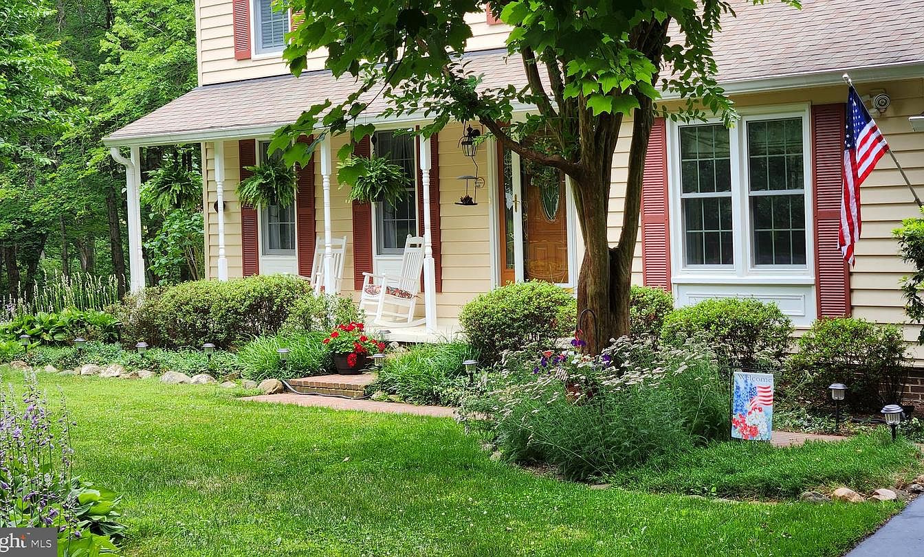 The front porch features classic white rocking chairs positioned symmetrically, inviting relaxation. The light yellow siding of the house complements the vibrant red shutters framing double-hung windows. Lush greenery, including ferns in hanging planters, enhances the space’s charm. The well-manicured garden displays a variety of colorful flowers, with red geraniums creating focal points in the landscaping. A welcome sign, bordered by floral decorations, adds a personal touch. The porch is well-lit with stylish fixtures, and the American flag waves gently, emphasizing a sense of pride and home. This area combines elegance with a warm, welcoming atmosphere.