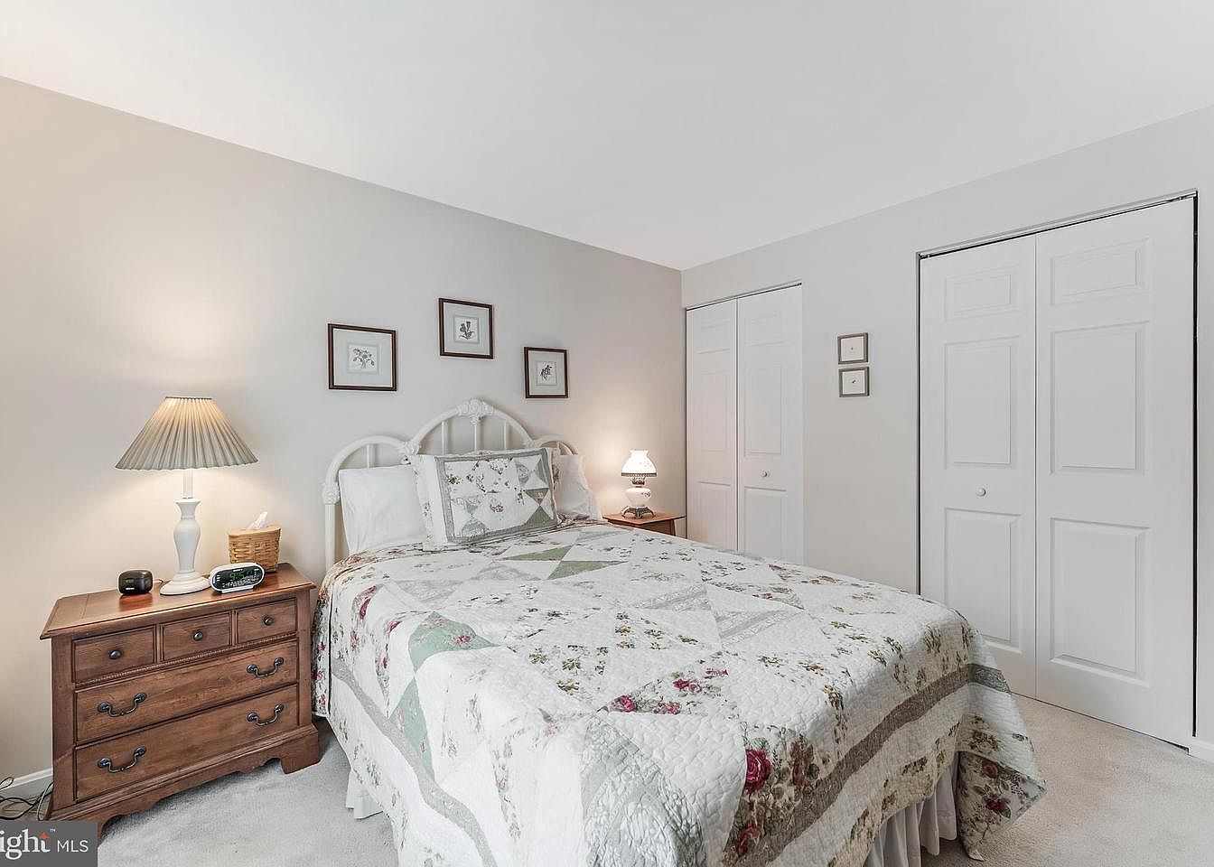 A cozy bedroom featuring a white, ornate bedframe with a quilted bedspread in soft floral patterns. A wooden nightstand beside the bed holds a vintage lamp with a pleated shade, a small basket, and an alarm clock. The walls are painted in a light neutral tone, enhancing the sense of calm. Above the bed, four small framed botanical artworks add a touch of nature. To the right, built-in sliding doors create storage space, seamlessly blending with the room’s aesthetics. The plush carpet underfoot softens the overall ambiance, inviting relaxation in this tranquil retreat.