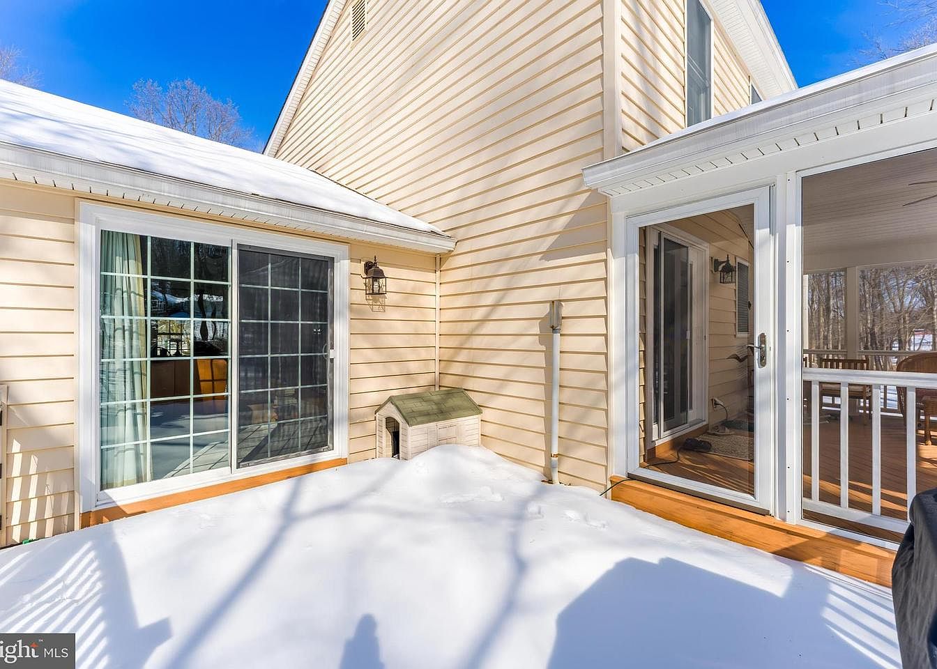 This back patio area showcases a blend of functionality and comfort. The light beige siding of the house harmonizes with the warm wooden deck, which extends into a snow-laden space. Enclosed by a large glass sliding door, the patio connects seamlessly to the outdoor environment, enhanced by a gentle natural light flooding in. A small doghouse with a green roof adds a charming element, indicating a pet-friendly atmosphere. The surrounding snow creates a serene contrast against the warm wooden tones, providing a tranquil but inviting space for relaxation or entertaining, with ample room for outdoor furniture.