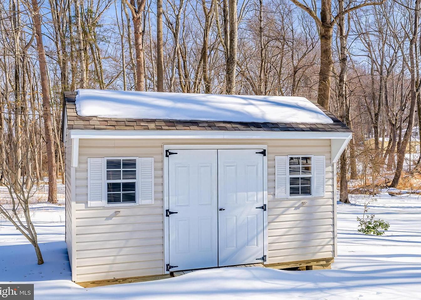A charming garden shed nestled in a snowy landscape. The structure features a simple yet appealing aesthetic with soft beige siding that contrasts beautifully against the white snow. Dual white doors, framed by sturdy black hardware, invite access, while two small windows adorned with decorative shutters enhance the facade’s character. The roof is complemented by a classic shingle design, adding to the rustic charm. Surrounding trees create a natural setting, their bare branches accentuating the serene winter scene. The raised base of the shed allows for easy maintenance, making it a practical yet attractive addition to the garden.