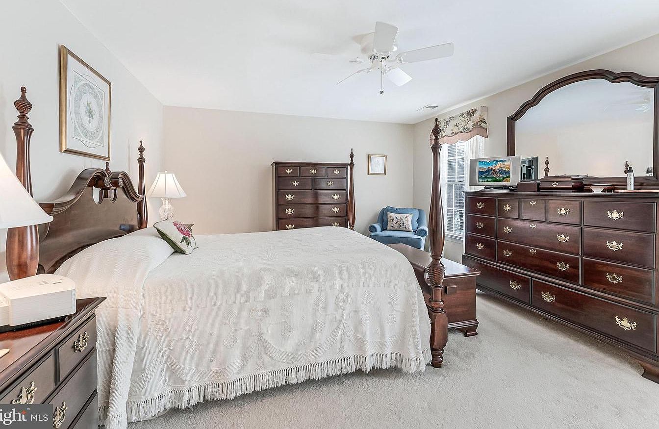 A spacious bedroom features a classic design with a four-poster wooden bed center stage, draped in a light-colored blanket. Flanking the bed are two elegant bedside tables with lamps casting a warm glow. The walls are painted in a soft beige, enhancing brightness. Complementing the decor are dark wood dressers, rich in detail, showcasing traditional hardware. A cozy reading corner includes a blue upholstered armchair adorned with floral pillows. Natural light streams through the window, where tasteful curtains frame the view. Plush carpeting maintains a serene atmosphere, making the space inviting and restful.