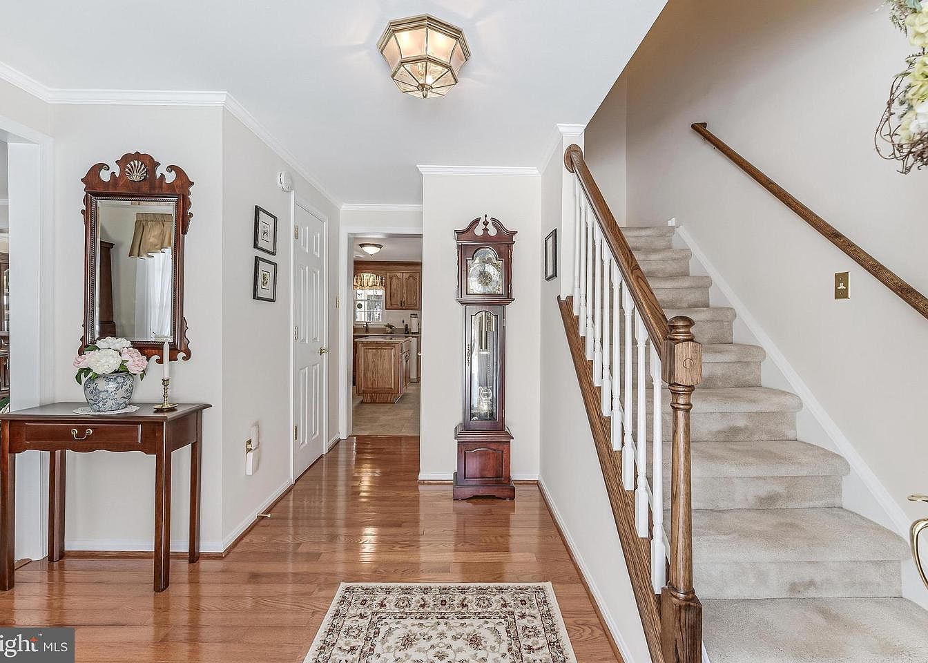 The entryway features rich hardwood flooring that glistens in natural light, providing a warm welcome. A classic wooden console table is adorned with a floral arrangement, adding a touch of elegance. Opposite, a tall grandfather clock creates a traditional focal point, while ornate mirrors and framed artwork enhance the space’s character. The soft beige walls offer a neutral backdrop, complemented by white wainscoting and trim that add architectural detail. A stylish light fixture illuminates the area. A staircase with polished wood railings leads to the upper levels, enhancing the room’s inviting ambiance.