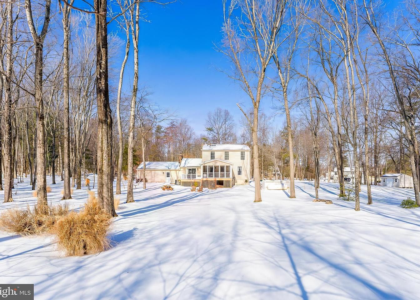 The image showcases the rear view of a historic American home, surrounded by a serene winter landscape. The house features two distinct sections: a two-story structure with light-colored siding and a one-story addition. The expansive backyard is blanketed in snow, creating a tranquil atmosphere highlighted by the tall, leafless trees casting shadows on the ground. A charming screened porch adorns the back, complemented by wooden decking. In the background, smaller outbuildings are visible, contributing to the rustic charm. The clear blue sky contrasts beautifully with the whites and browns of the snowy landscape, enhancing the peacefulness of the setting.