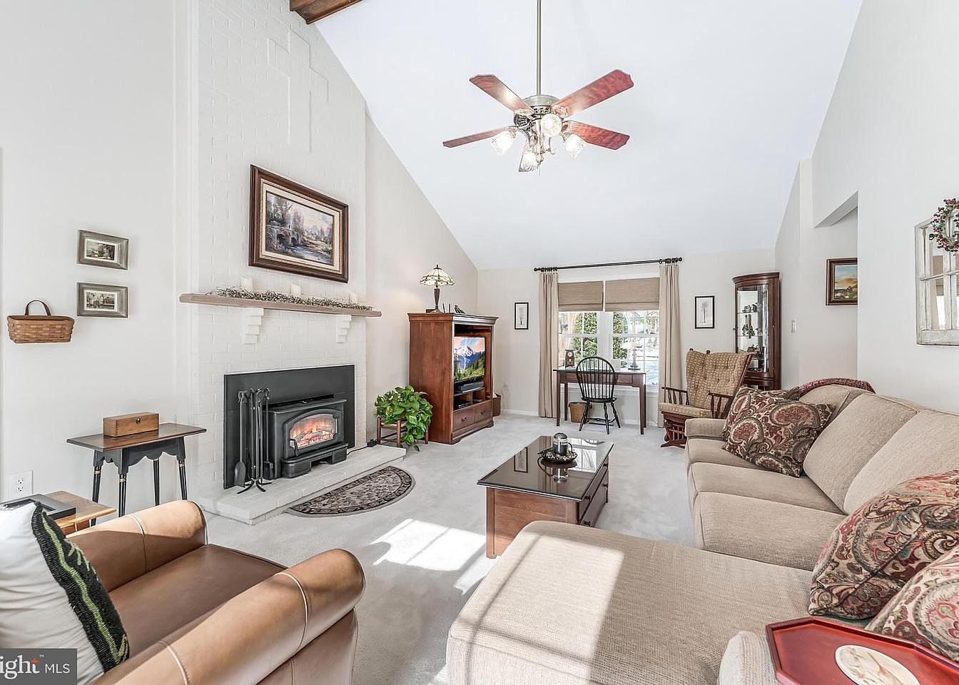 This inviting living room features a high, sloped ceiling that enhances the spacious feel. Soft beige carpeting covers the floor, creating a warm and cozy atmosphere. A large, sectional sofa adorned with decorative pillows is prominent, along with a classic wooden coffee table. Natural light floods the space through sliding glass doors, complemented by light curtains. A brown leather armchair adds a touch of elegance, while a tasteful area rug defines the seating area. A black fireplace set against a white brick wall provides a charming focal point. Subtle wall decor and soft lighting create a relaxing ambiance.
