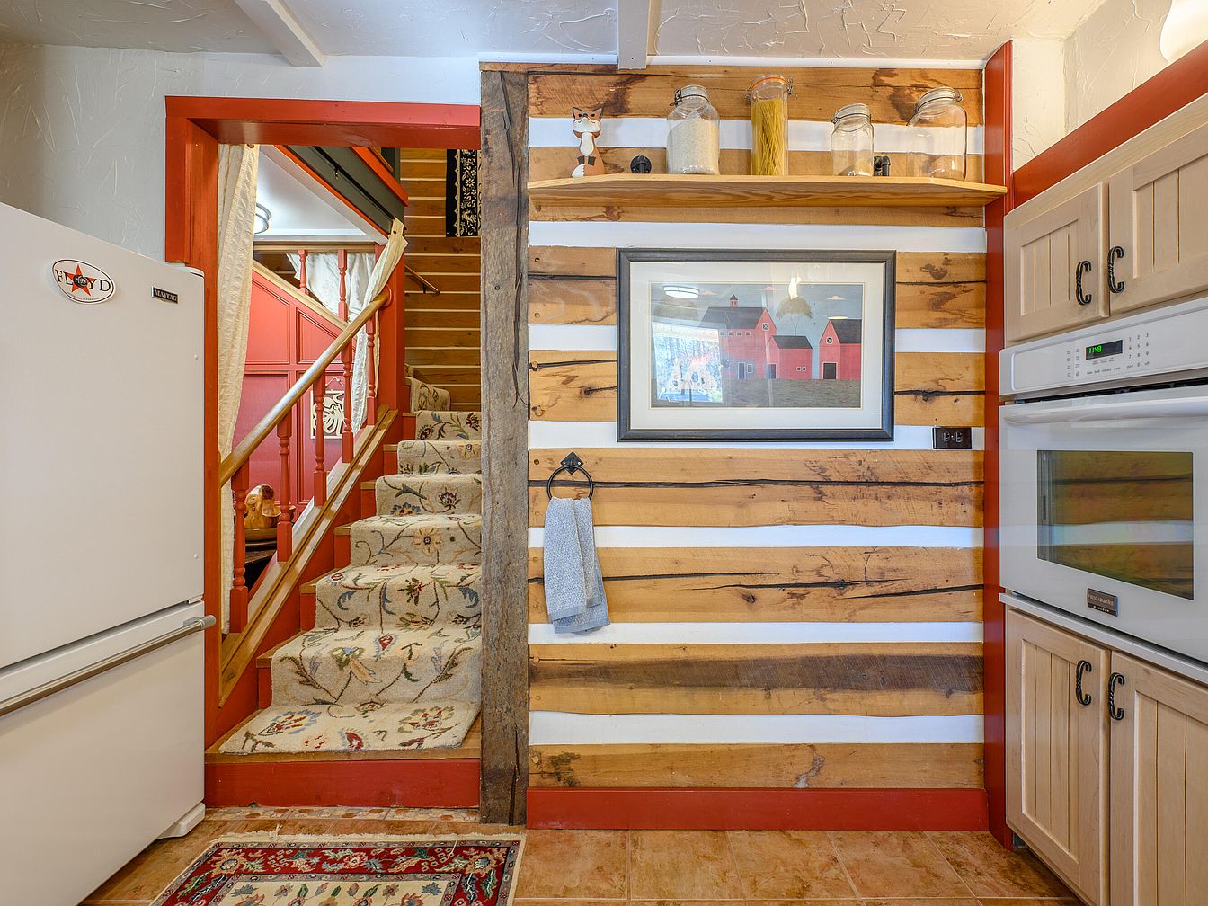 This image captures a cozy entryway into the kitchen, showcasing a blend of rustic charm and modern convenience. The wall features a striking arrangement of wooden planks alternating with white stripes, enhancing the warmth of the space. A framed artwork of red barns adds a pop of color, harmonizing with the vibrant red trim around the doorframe and stairway. To the left, a white refrigerator contrasts with the natural wood, while built-in cabinetry exhibits a light finish with dark hardware, enhancing the farmhouse aesthetic. The patterned stair carpet and colorful area rug provide texture and softness, inviting you further into the home.