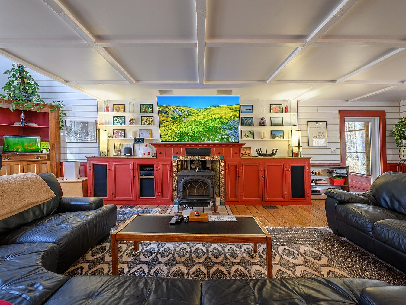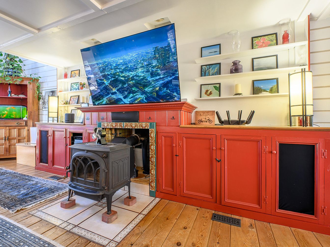 This living room features a striking red cabinetry that contrasts with the light, wooden flooring. A modern, large flat-screen television is mounted above a rustic, tiled fireplace, which showcases an elegant wood stove. The room is thoughtfully arranged, with diverse decor items on the shelves, including framed artwork and decorative vases that add color and character. A feature rug with intricate designs introduces warmth to the space. The shelves are well-lit, enhancing the overall ambiance. To the left, a small wooden cabinet complements the warmth of the flooring, creating an inviting and cozy atmosphere.