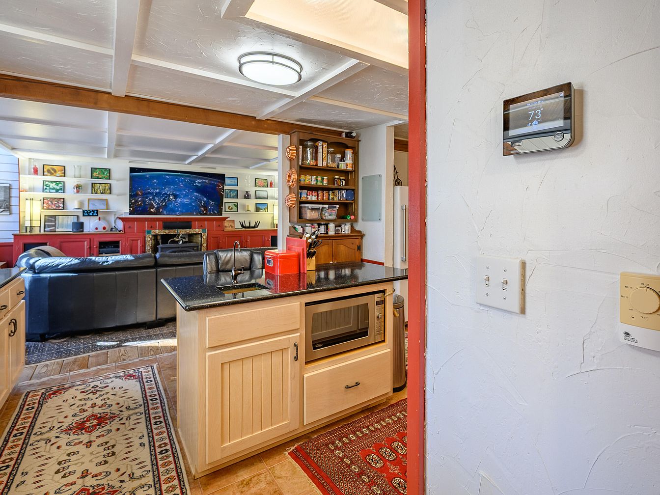 A cozy kitchen and living area blend seamlessly with an open layout. The sleek black granite countertop contrasts beautifully against light wooden cabinetry. An elegant rug featuring intricate patterns adds warmth and color to the tiled floor. In the background, a deep red wall houses a large entertainment unit, complemented by neatly arranged decorative shelves featuring artwork and personal items. A plush black sectional couch invites relaxation, facing a contemporary wall-mounted television. Ambient lighting fixtures contribute to a welcoming atmosphere, while modern appliances and a thermostat emphasize practical living.