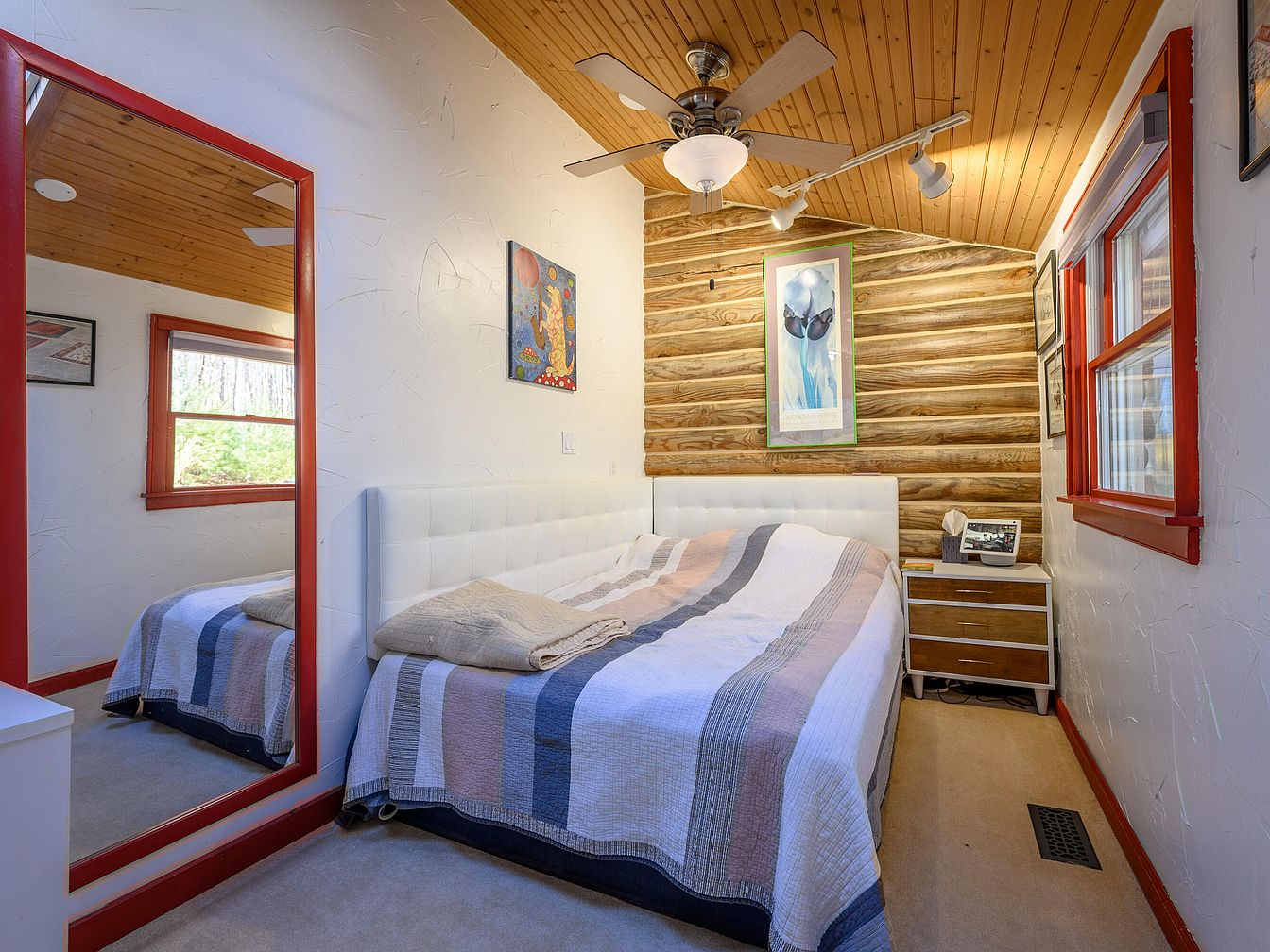 A cozy bedroom features a modern white upholstered bed positioned against a textured wooden wall, creating a rustic yet contemporary feel. The ceiling is adorned with wooden planks, while a ceiling fan provides comfort. Bright red trim around the windows and a mirror enhances natural light, adding vibrancy. A soft, multicolored blanket drapes the bed, echoing the color scheme with tones of beige, blue, and pink. Beside the bed, a wooden nightstand holds a small lamp and digital device. Artwork on the walls, including a playful painting and framed images, imbue personality and charm into the intimate space.