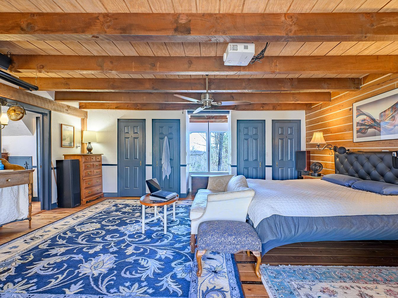 A spacious bedroom features a cozy ambiance, accentuated by dark wooden beams that contrast with the rich, light-stained walls. The color palette includes soft blues and creams, with a large, tufted bed and matching linens. A decorative area rug covers the wooden floor, its intricate floral patterns bringing warmth to the room. Furniture pieces, such as a vintage dresser and side tables, echo classic design elements with their warm hues. Two blue doors are symmetrically placed, contributing to the room’s balance, while ambient light illuminates the space from a charming lamp. The overall aesthetic is a blend of rustic charm and modern comfort.