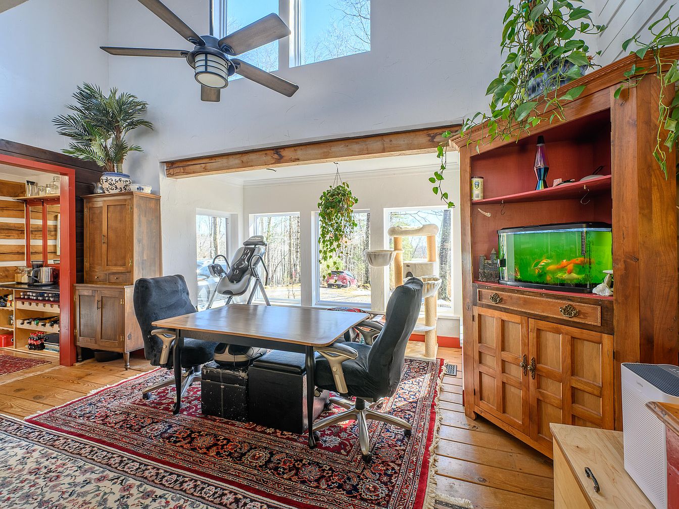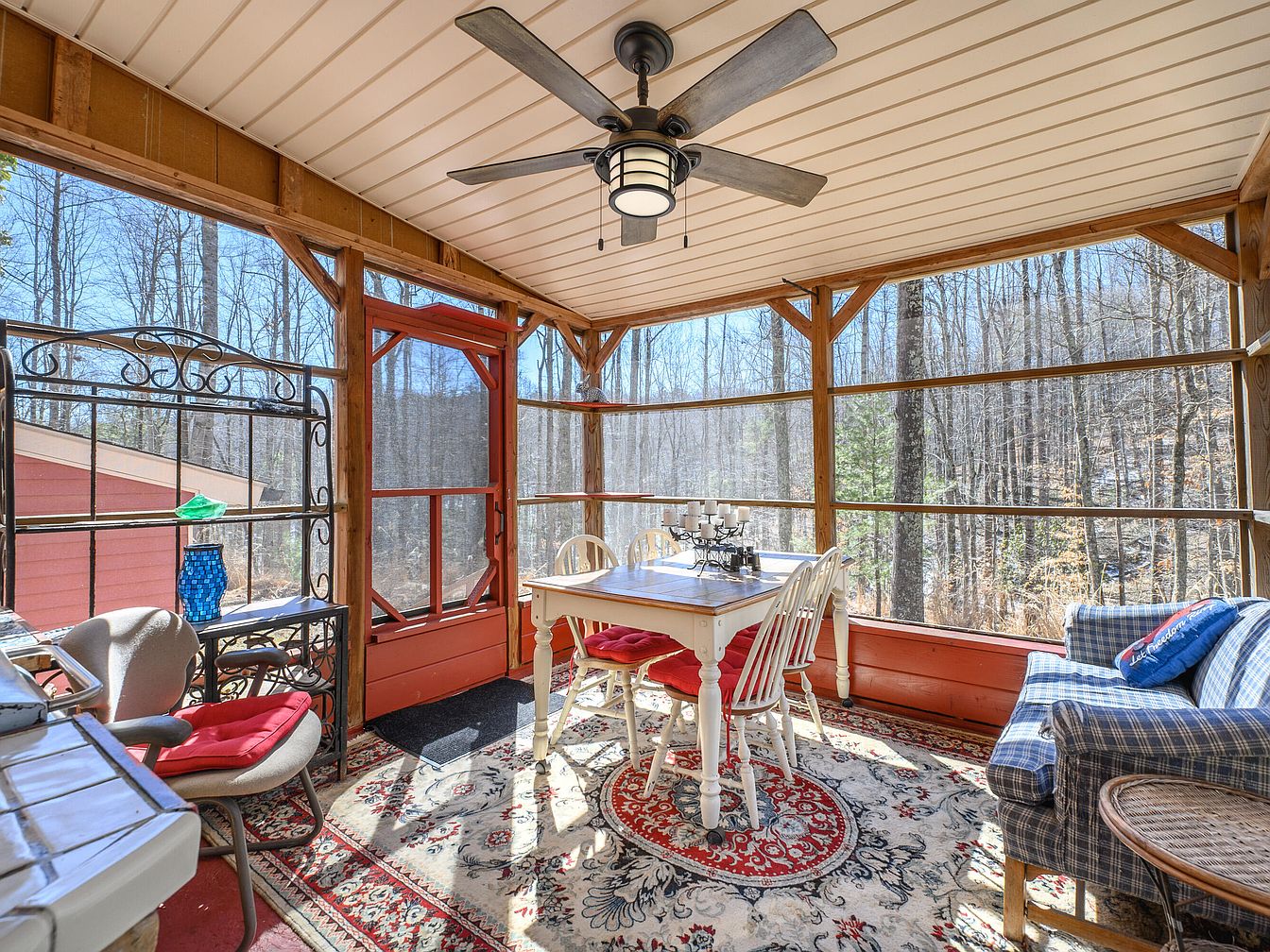 This sunlit sunroom features a warm, inviting atmosphere with its wooden beams and large screened windows overlooking a wooded landscape. A cozy white dining table, accented with red chairs, invites gatherings, while a patterned area rug adds charm underfoot. A comfortable plaid couch enhances relaxation, complemented by a wicker side table. Decorative elements include a wrought iron display rack and a blue glass vase, introducing pops of color. A ceiling fan circulates air, contributing to comfort. The natural light creates a serene ambiance, ideal for savouring morning coffee or enjoying afternoon reads.