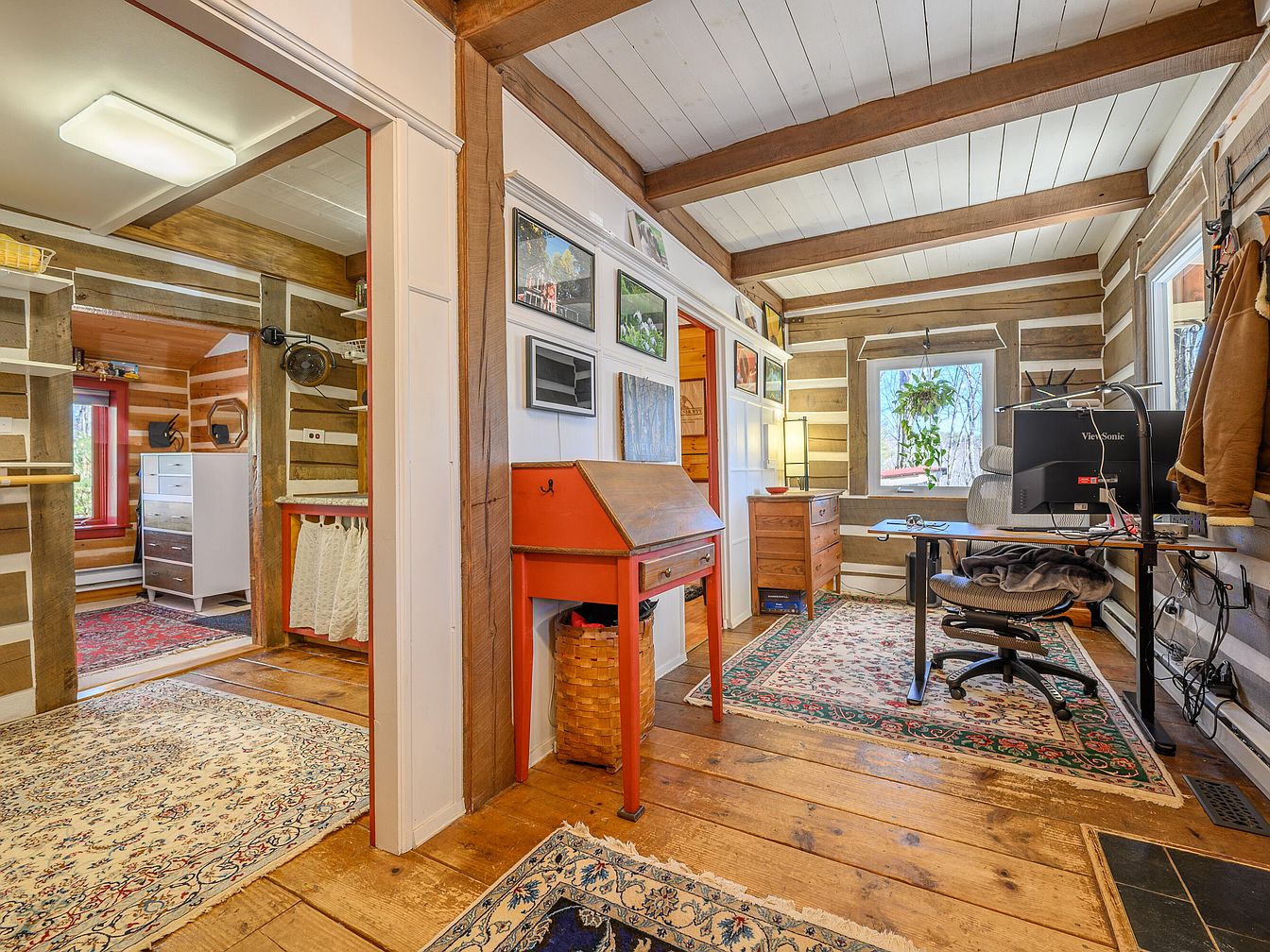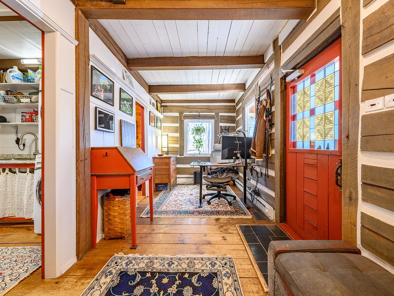 This entryway blends rustic charm and functionality. Exposed wooden beams and log walls provide a warm, inviting ambiance. A striking red door displays stained glass panels, allowing light to filter through, enhancing the colors inside. The layout reveals a compact workspace with a sleek black office chair paired with a modern desk. The warm wood floor contrasts beautifully with traditional area rugs, adorned with intricate patterns in blue and cream. To the left, a painted orange desk adds a pop of color, while a woven basket suggests practicality. Framed photographs line the walls, celebrating personal history.