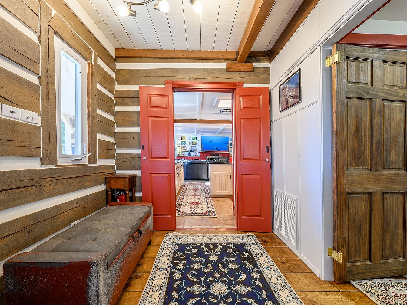 The entryway features rustic log cabin walls, showcasing natural wood textures with contrasting white stripes. Centered bright red double doors serve as a striking focal point, leading to the main living area. A tufted, vintage-style bench sits against the wall, offering both seating and storage. An ornate, patterned area rug in navy and cream adds warmth and elegance underfoot. Exposed wooden beams extend across the ceiling, enhancing the home’s historic charm. Natural light streams through a window, illuminating the space, while simple light fixtures provide a modern touch, balancing rustic aesthetics with contemporary elements.
