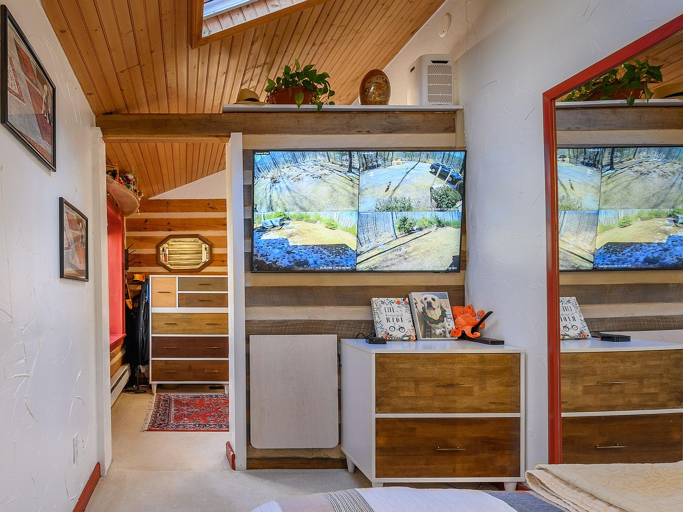 A cozy bedroom featuring warm wood tones and modern decor. The ceiling is adorned with wooden planks, enhancing the cabin feel. The layout includes a large wall-mounted TV displaying multiple camera feeds, flanked by stylish wooden drawers with varying finishes. A decorative mirror adds depth, reflecting vibrant elements. A plush bed with neutral linens anchors the space, complemented by a soft area rug with intricate patterns. Decor items, such as books and an orange plush toy, are thoughtfully arranged on the nightstand. Potted plants add a touch of greenery, providing a serene and inviting atmosphere.