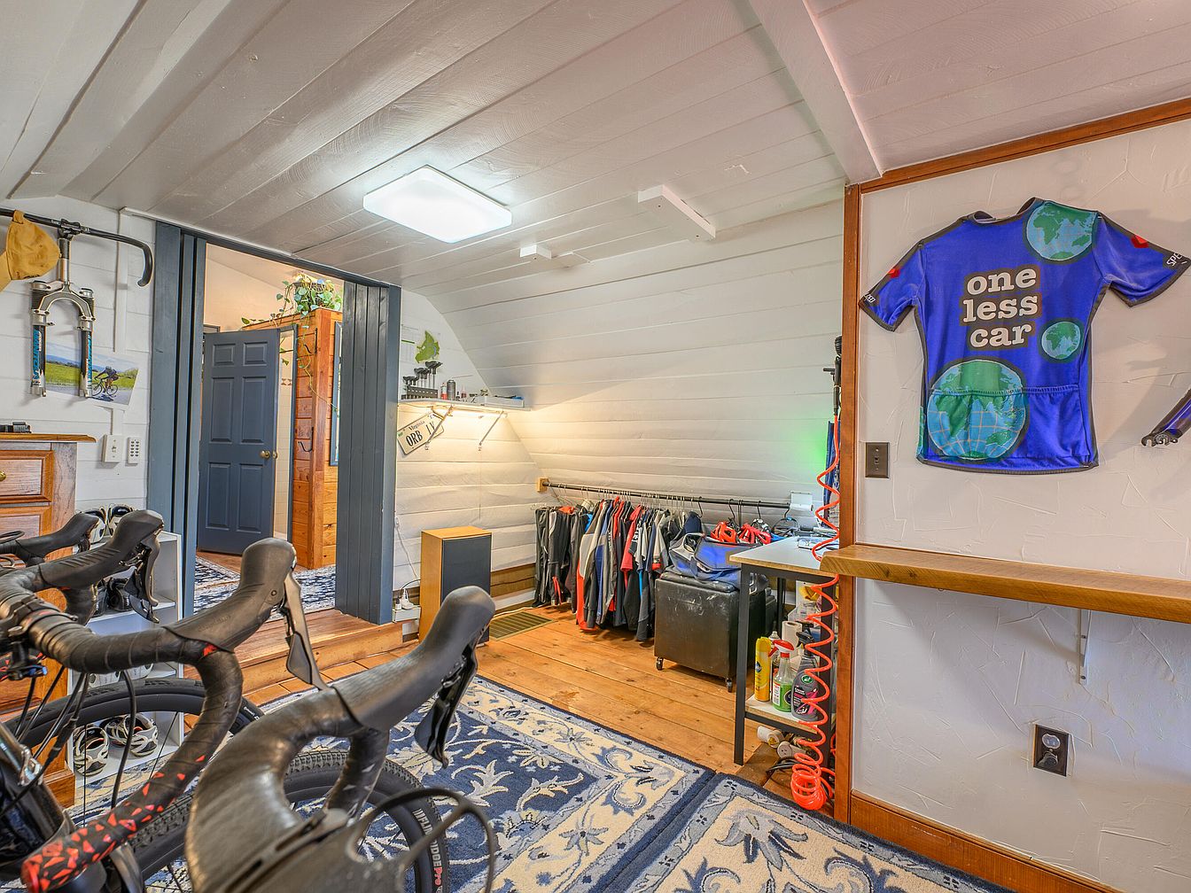 This image showcases a bike garage with an organized layout. The space features a light wood floor complemented by a decorative blue and cream area rug. Walls are painted white, enhancing the brightness and spacious feel. Prominently displayed are several bicycles, featuring intricate handlebars and sleek frames. On the left, a wooden dresser holds various biking accessories. Clothing hangs on a mounted rack, showcasing cycling jerseys in vibrant colors. A blue door leads to another room, framed by rustic wood accents. A wall-mounted jersey with an environmental message adds character and promotes sustainability in cycling.