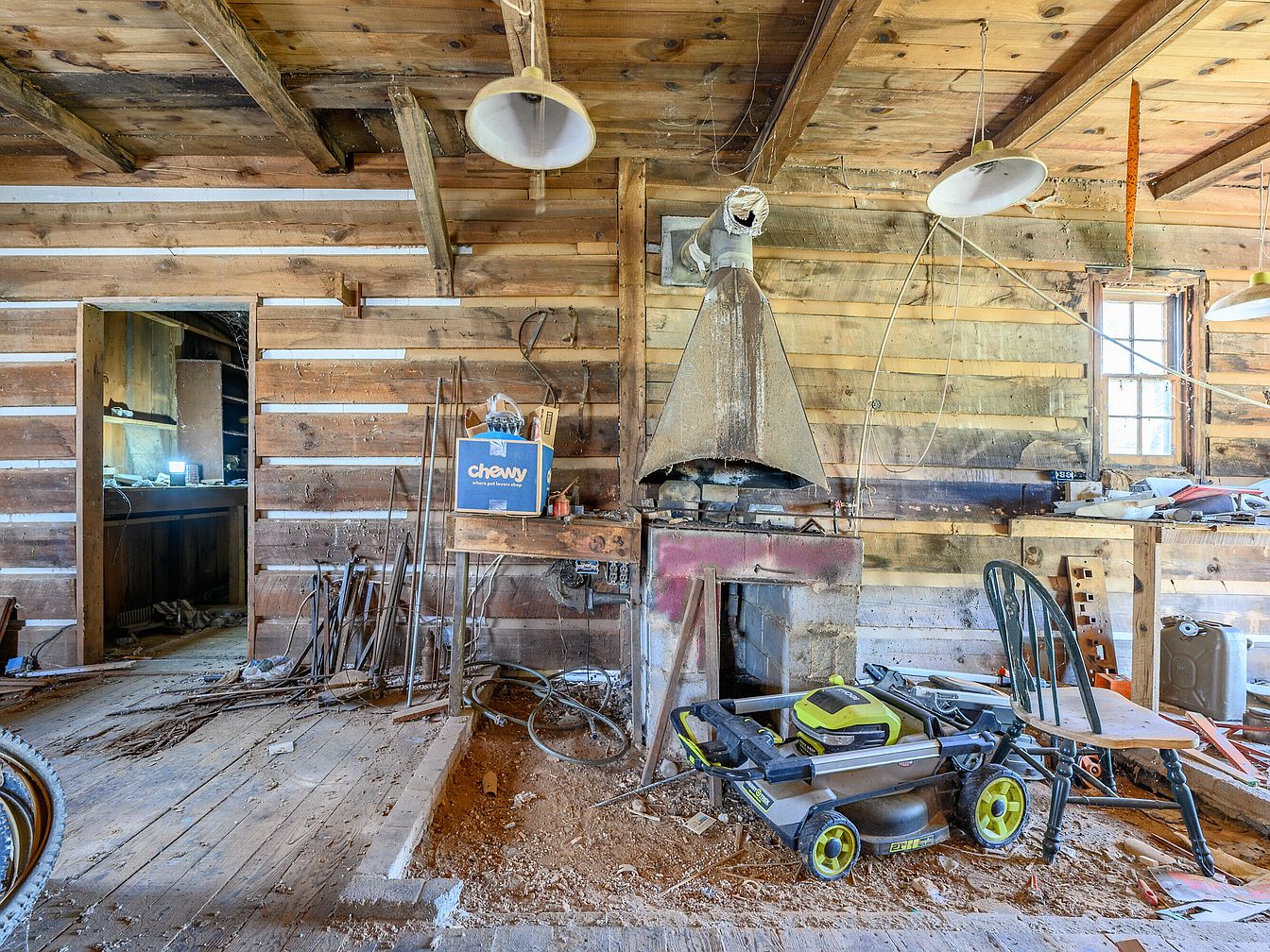 This rustic workshop showcases exposed wooden beams and a natural wood-paneled wall, reflecting a bygone era. The sloped ceiling, adorned with vintage light fixtures, casts a warm glow over the space. In the center, a large stone fireplace serves as a focal point, featuring an angled metal chimney that hints at its historical functionality. Scattered tools and equipment, including a lawnmower and various metal rods, suggest a space filled with ongoing projects. Cobwebs in corners and wood shavings on the floor highlight the room’s utilitarian nature, while a small window allows natural light to filter in.